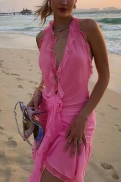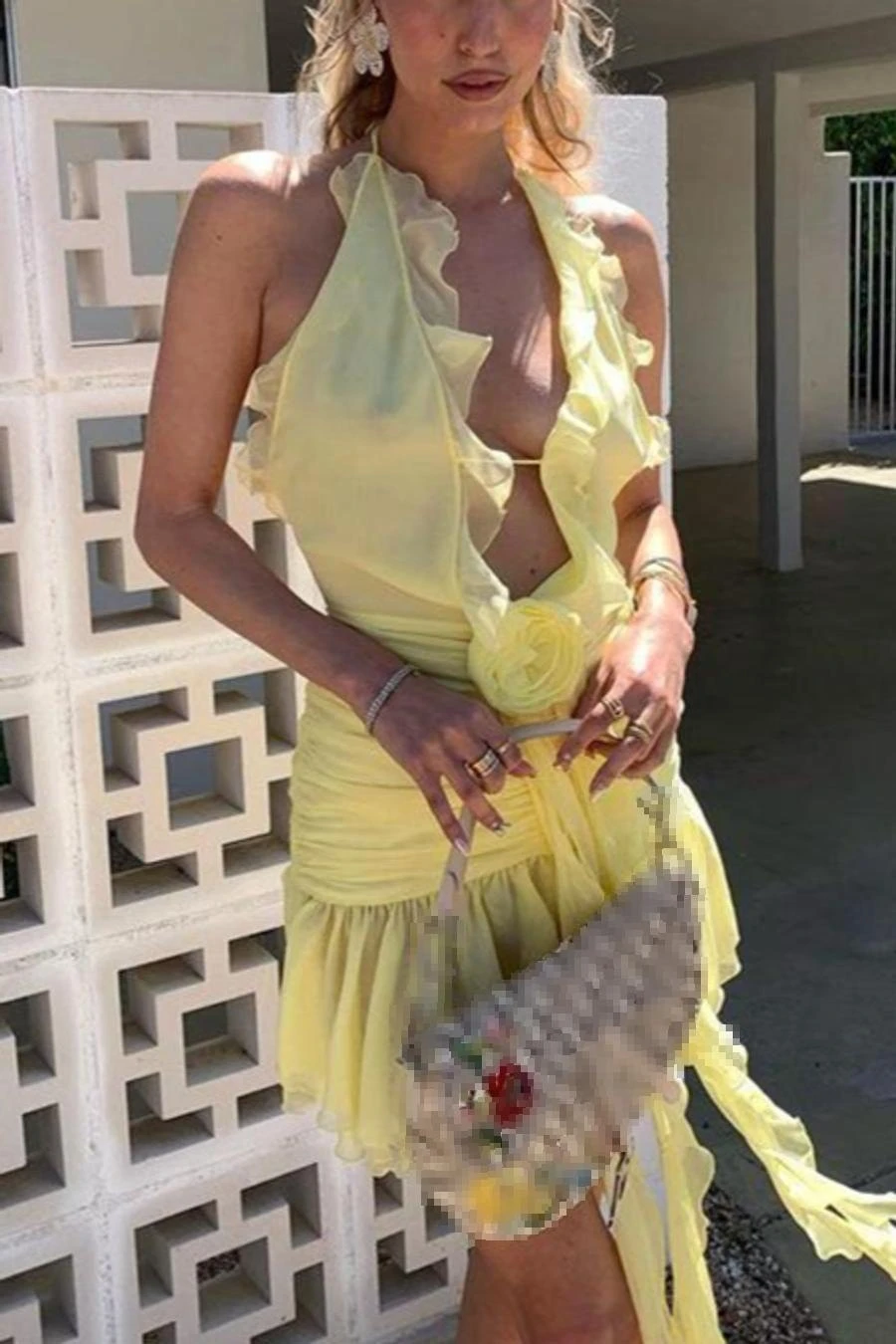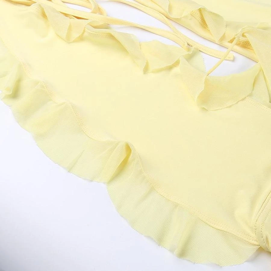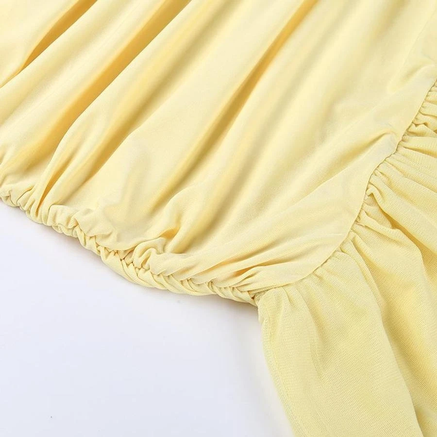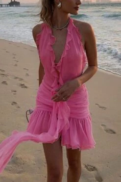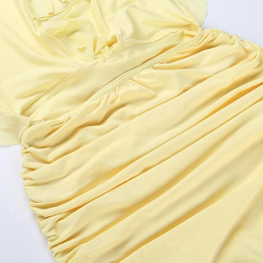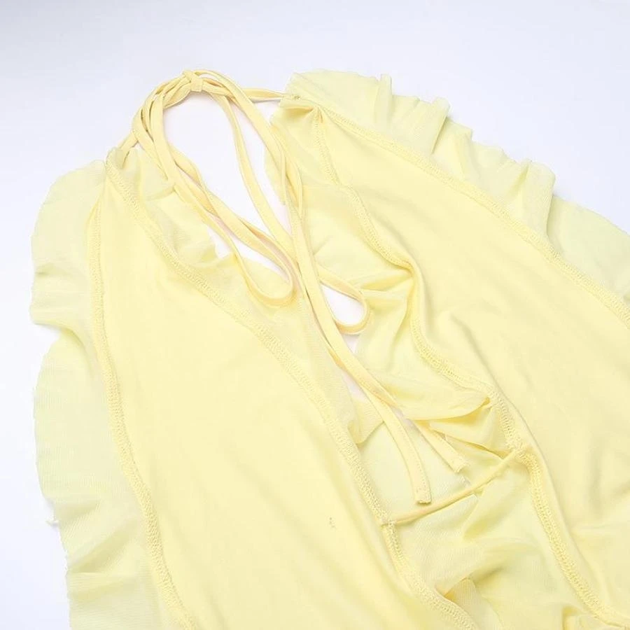 Sexy slight stretch ruffle flower decor halter-neck shirring mini dress