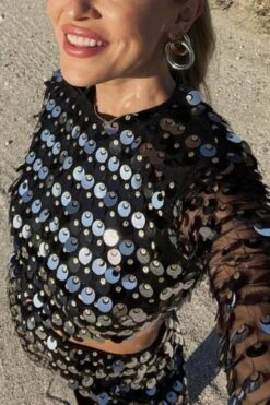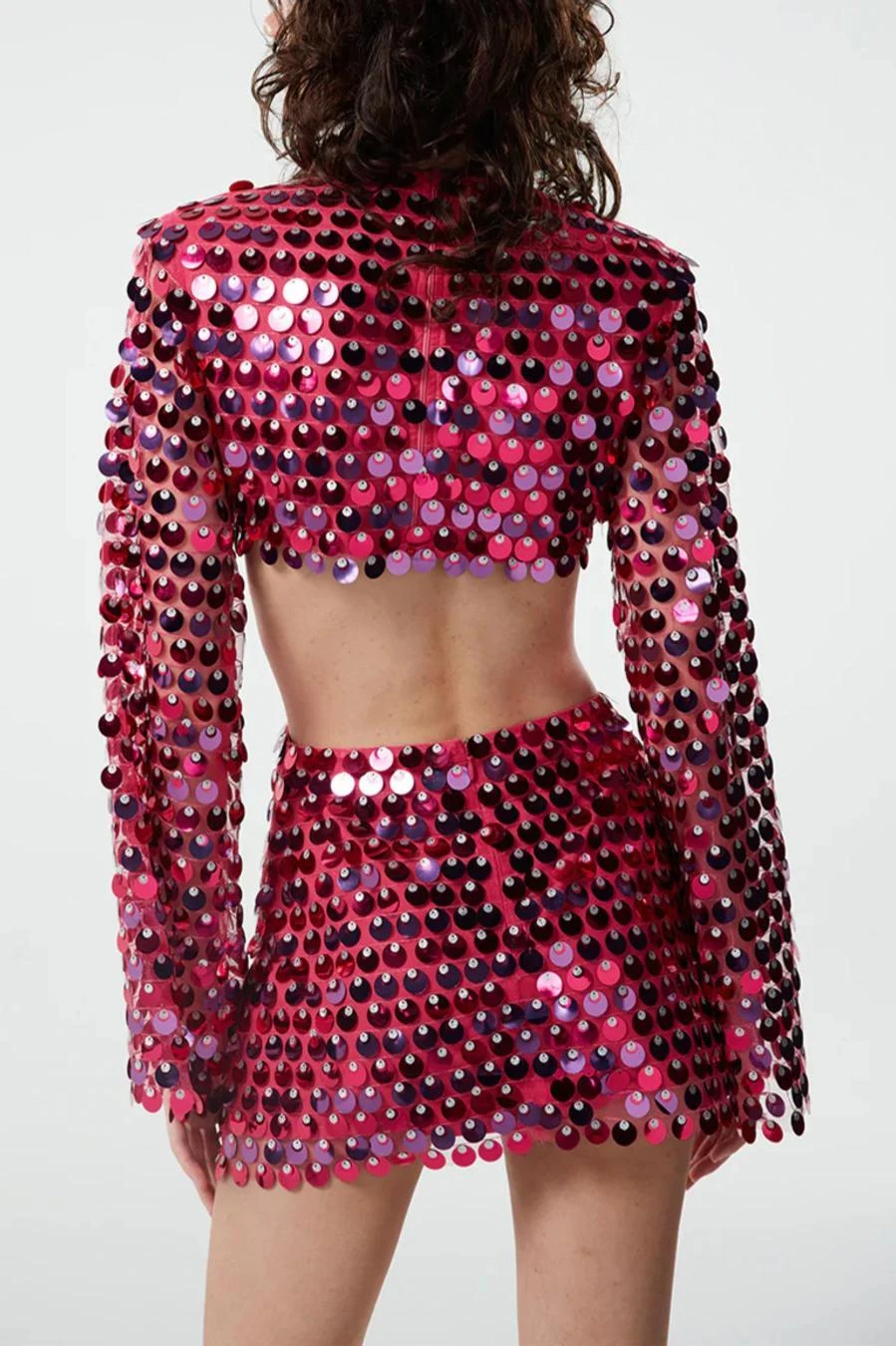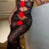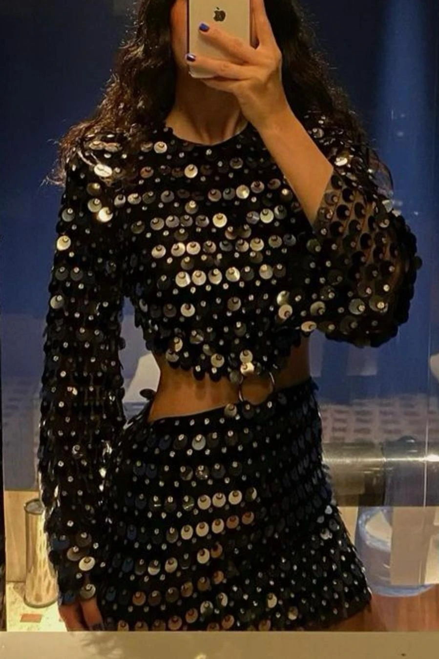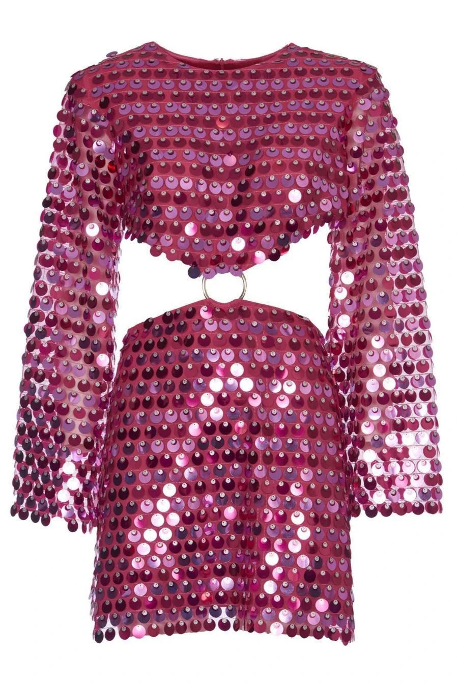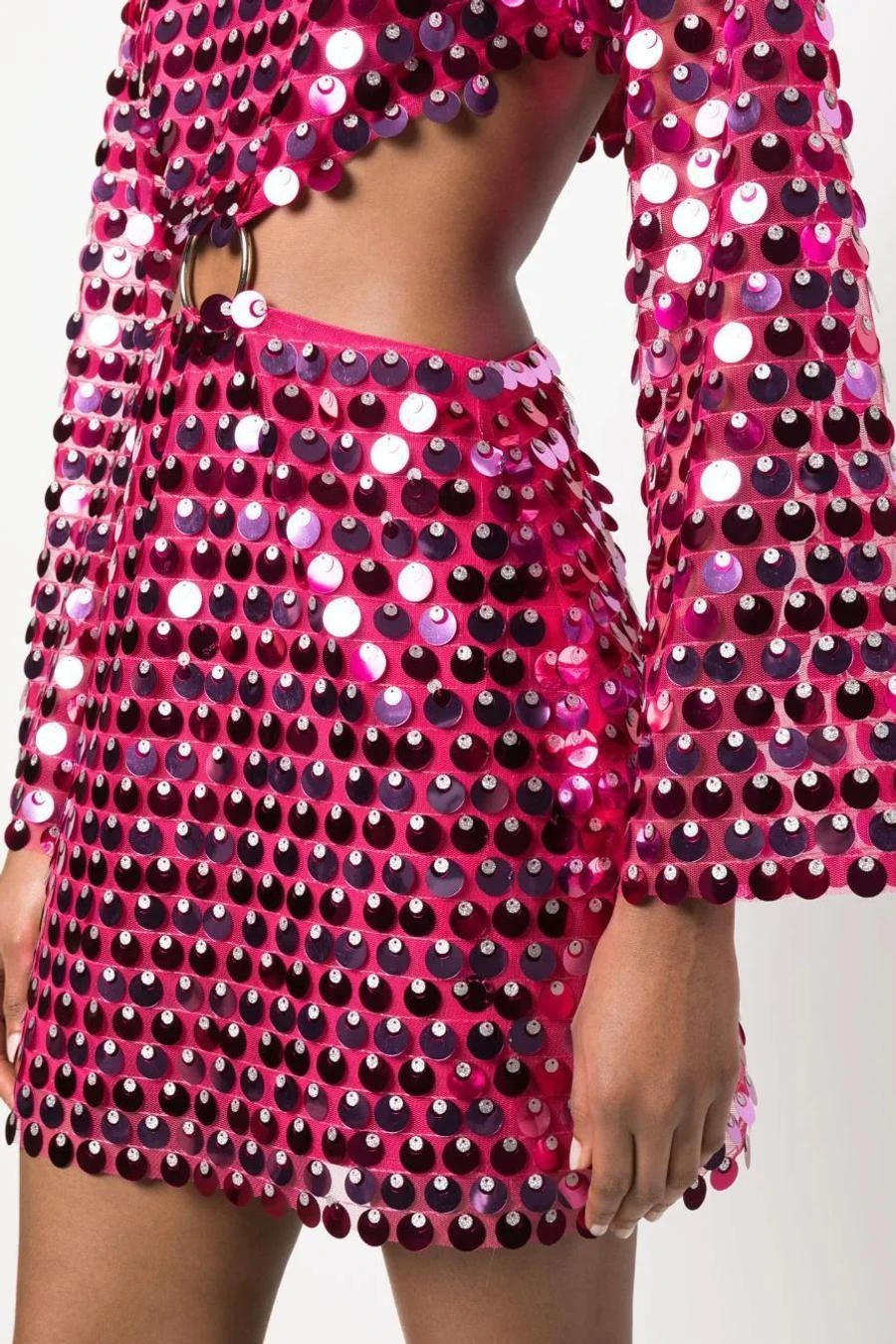 Sexy slight stretch sequins mesh metal ring decor hollow mini dress