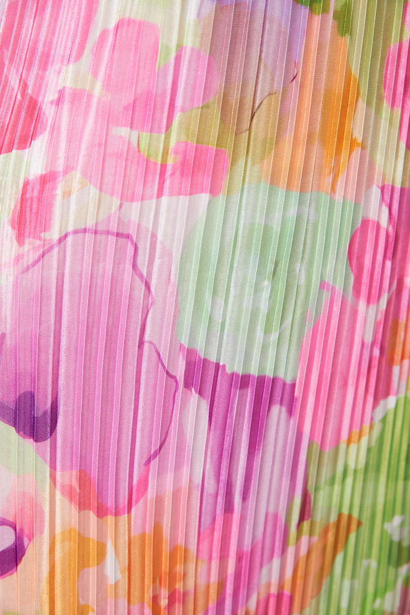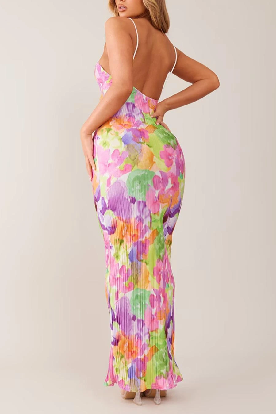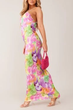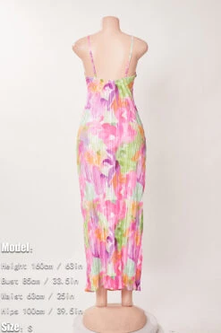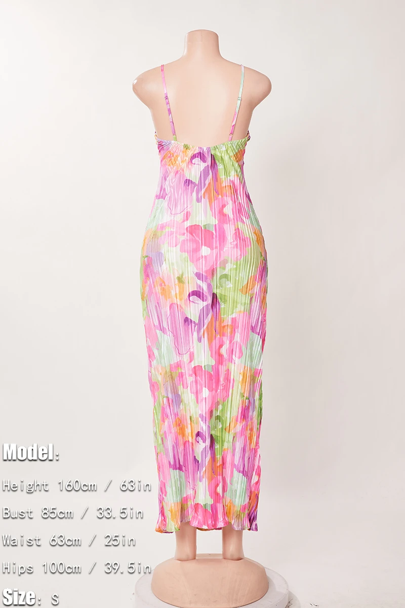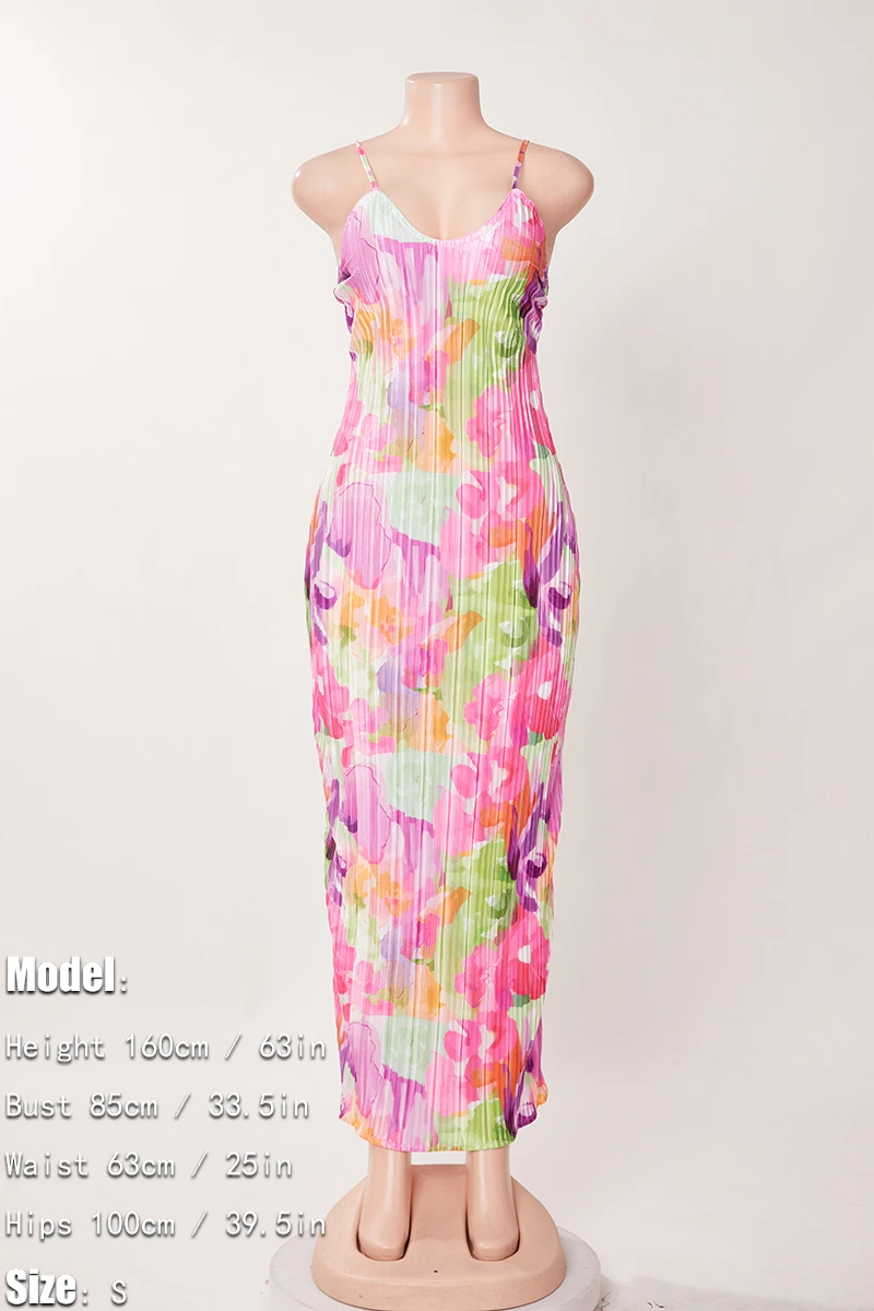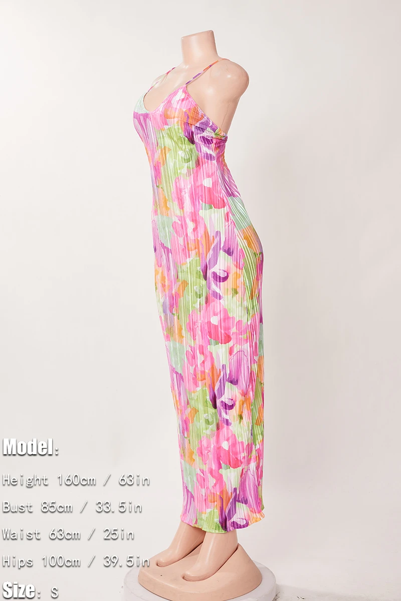 Sexy slight stretch sling backless tie-dye printing pleated maxi dress