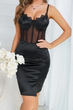 Sexy slight stretch sling lace mesh stitching satin slit mini dress(with underwire)