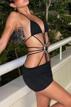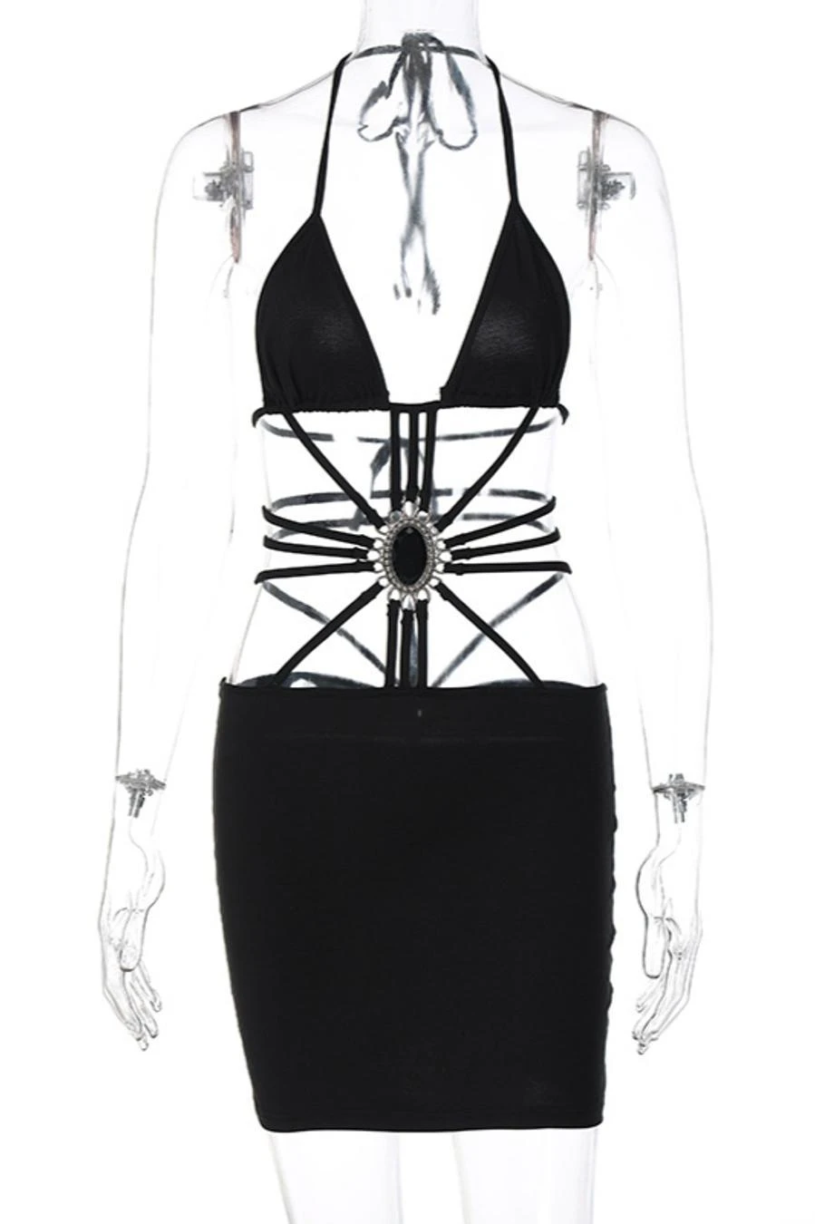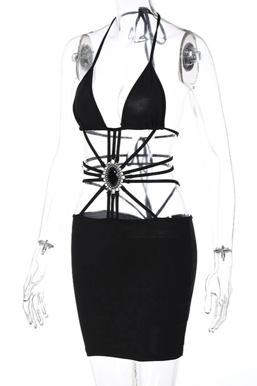 Sexy slight stretch solid color bandage halter-neck hollow slim mini dress