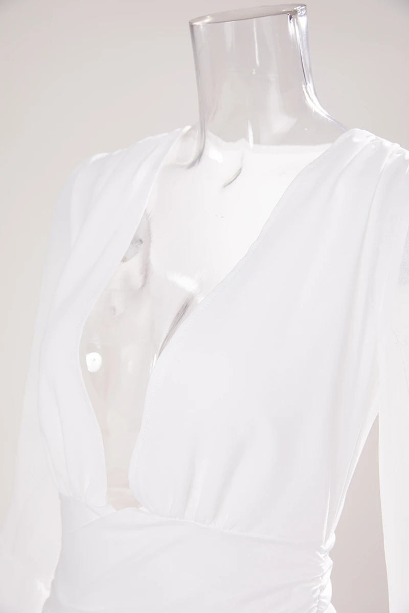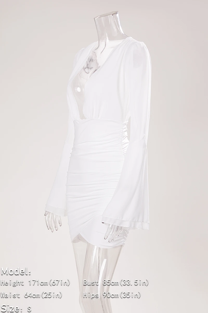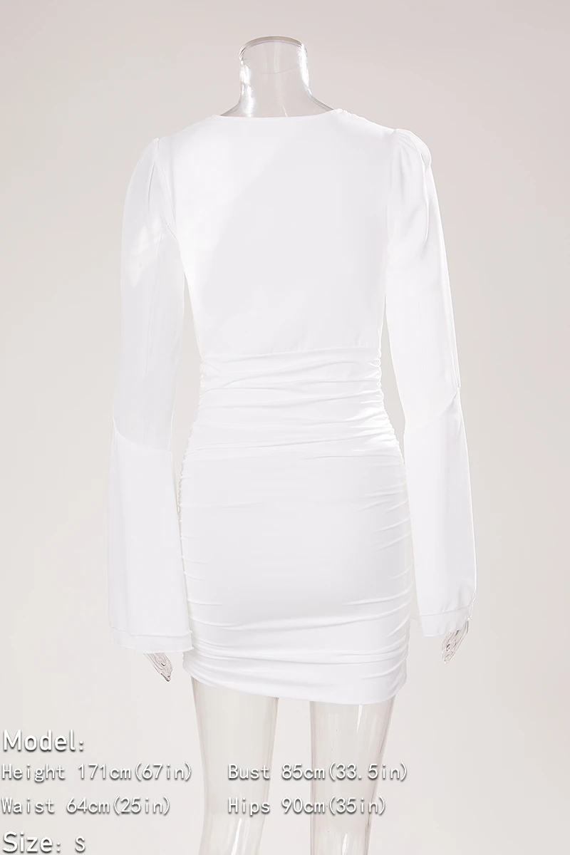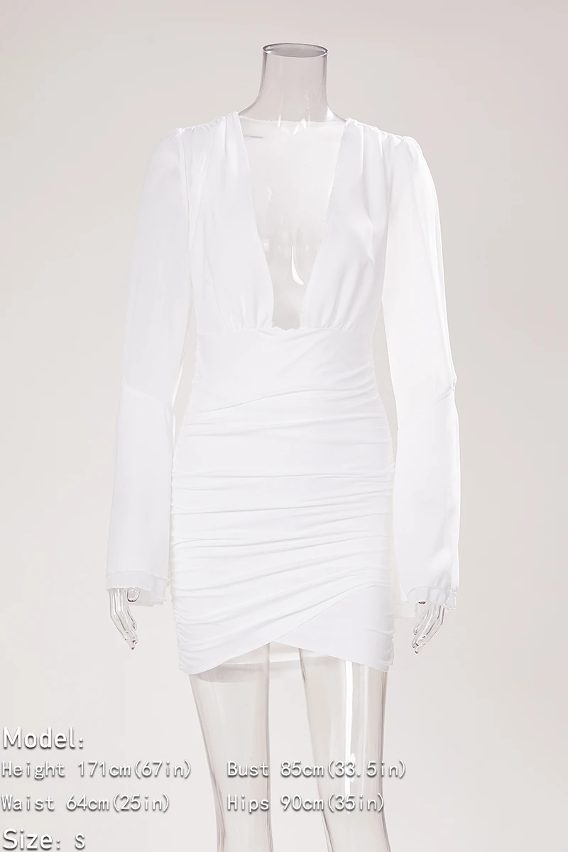 Sexy slight stretch solid color deep v tight shirring mini dress