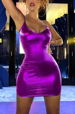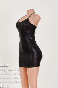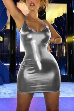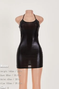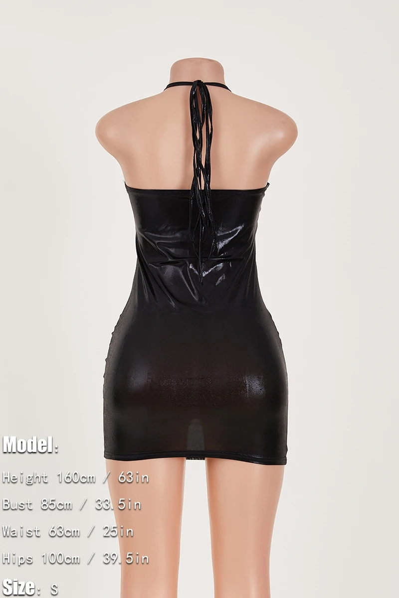Sexy slight stretch solid color halter neck slim holographic fabric mini dress