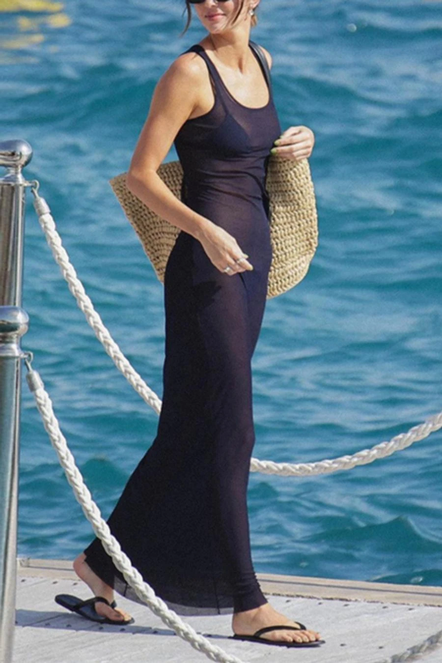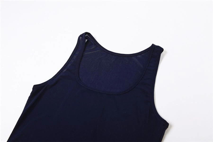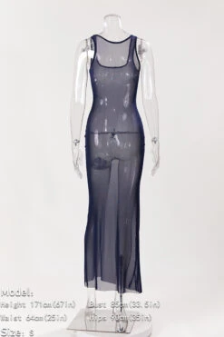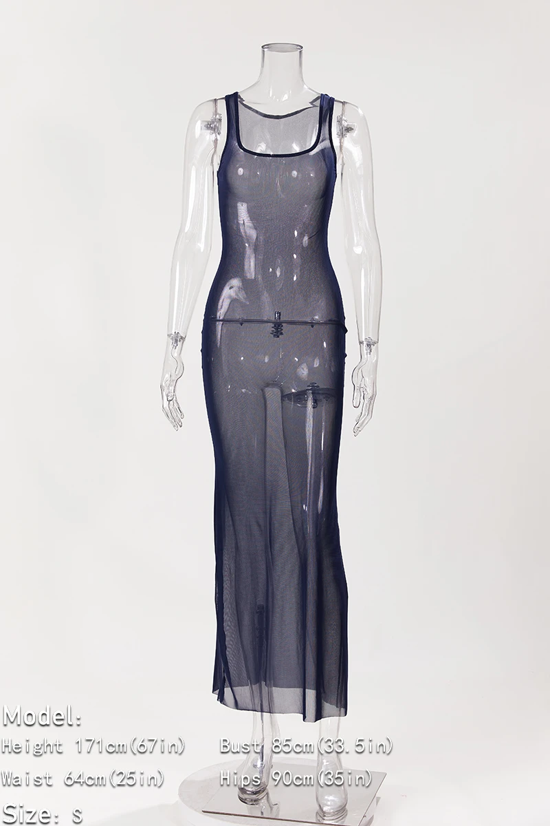 Sexy slight stretch solid color mesh see-through sleeveless maxi dress