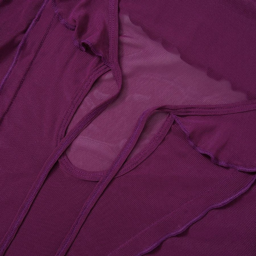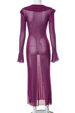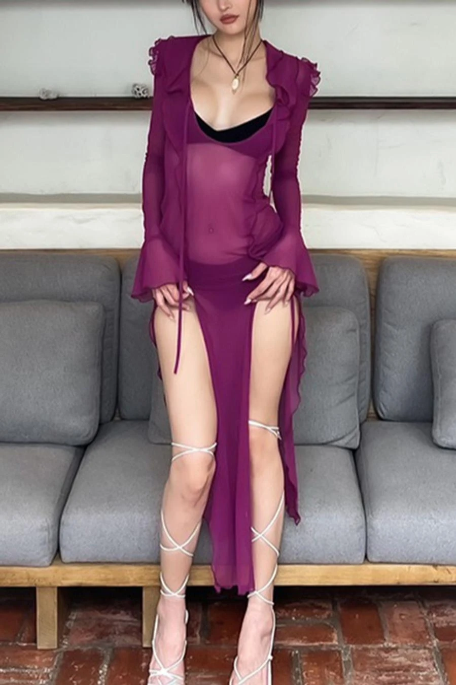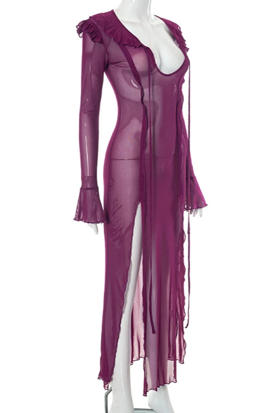 Sexy slight stretch solid color see-through mesh slit maxi dress