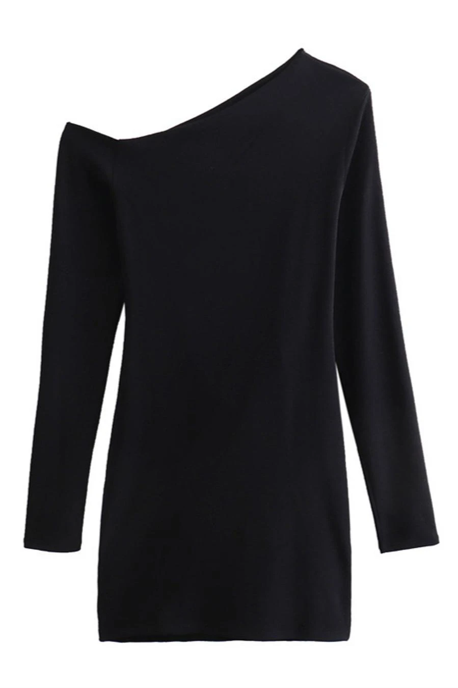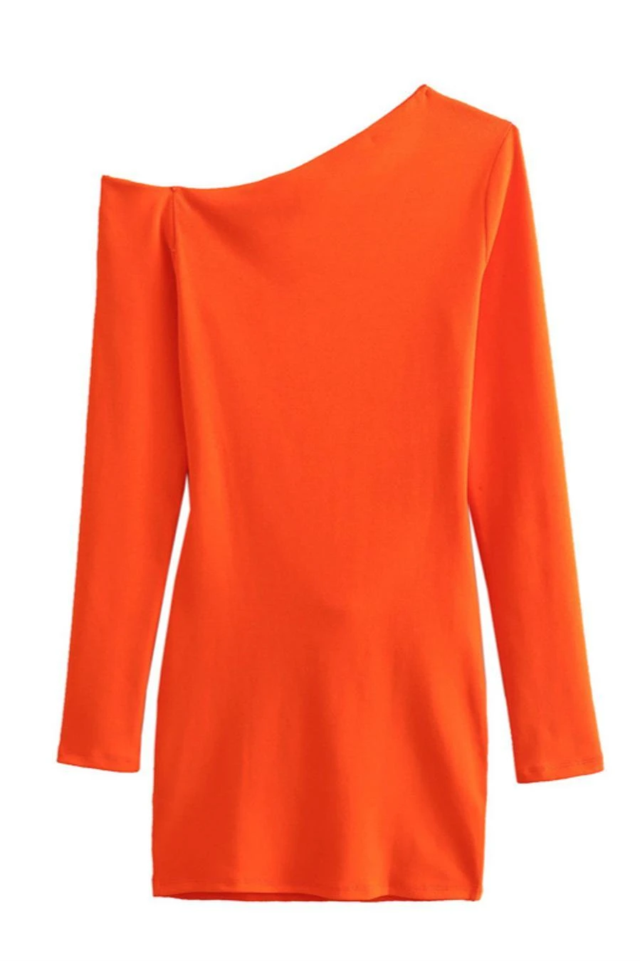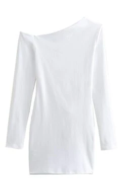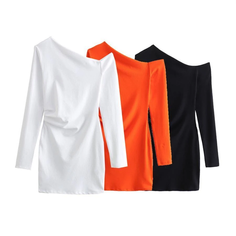 Sexy slight stretch solid color slanted shoulder mini dress