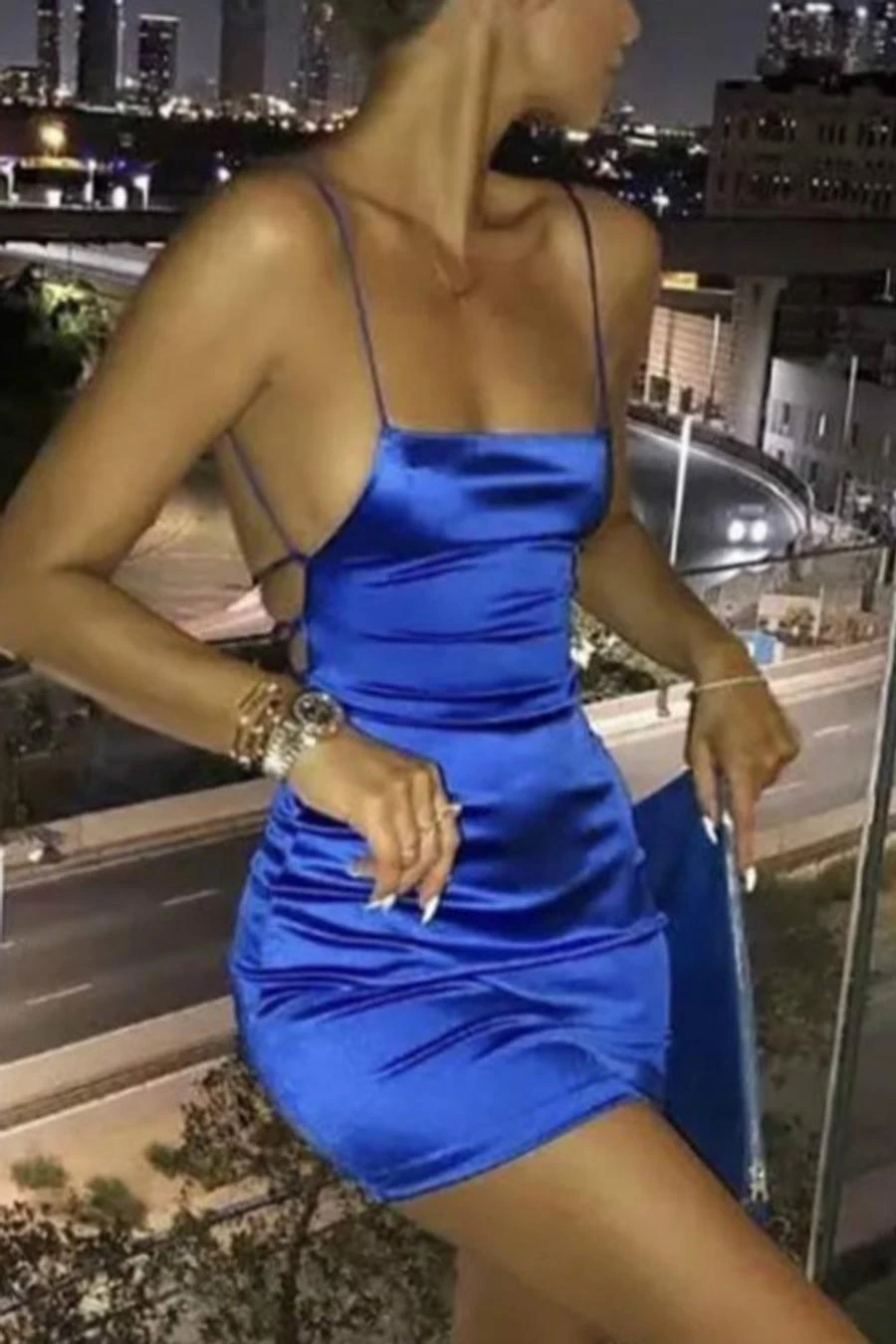 Sexy slight stretch solid color sling satin backless shirring slim mini dress