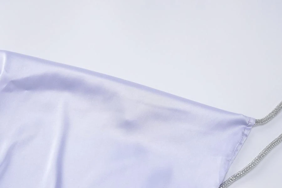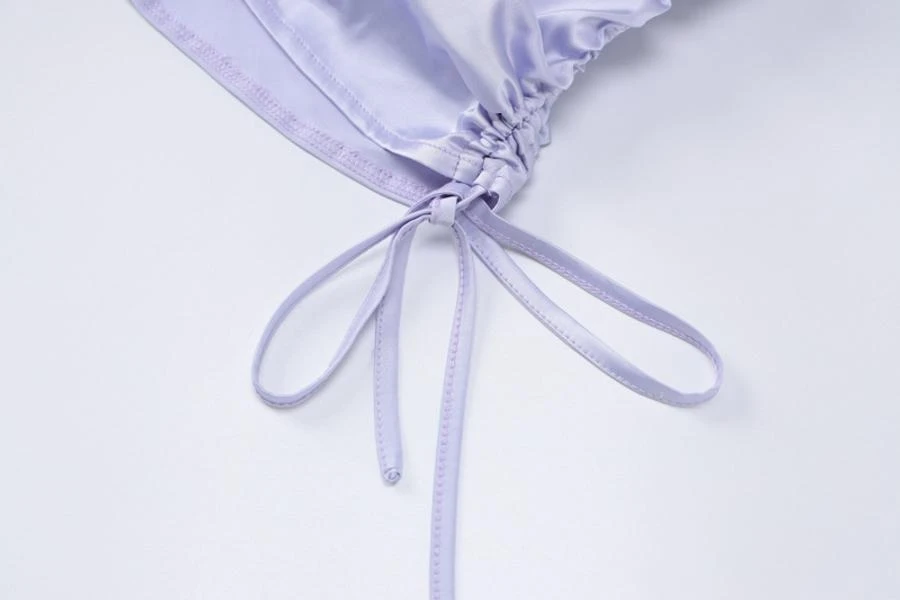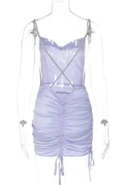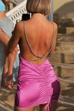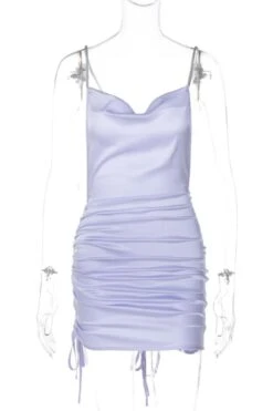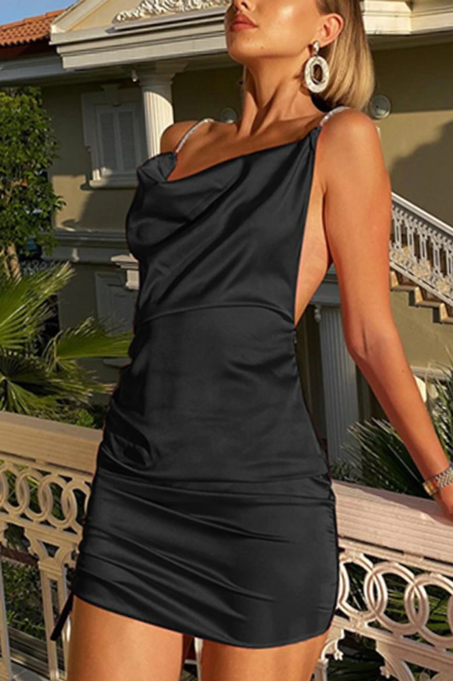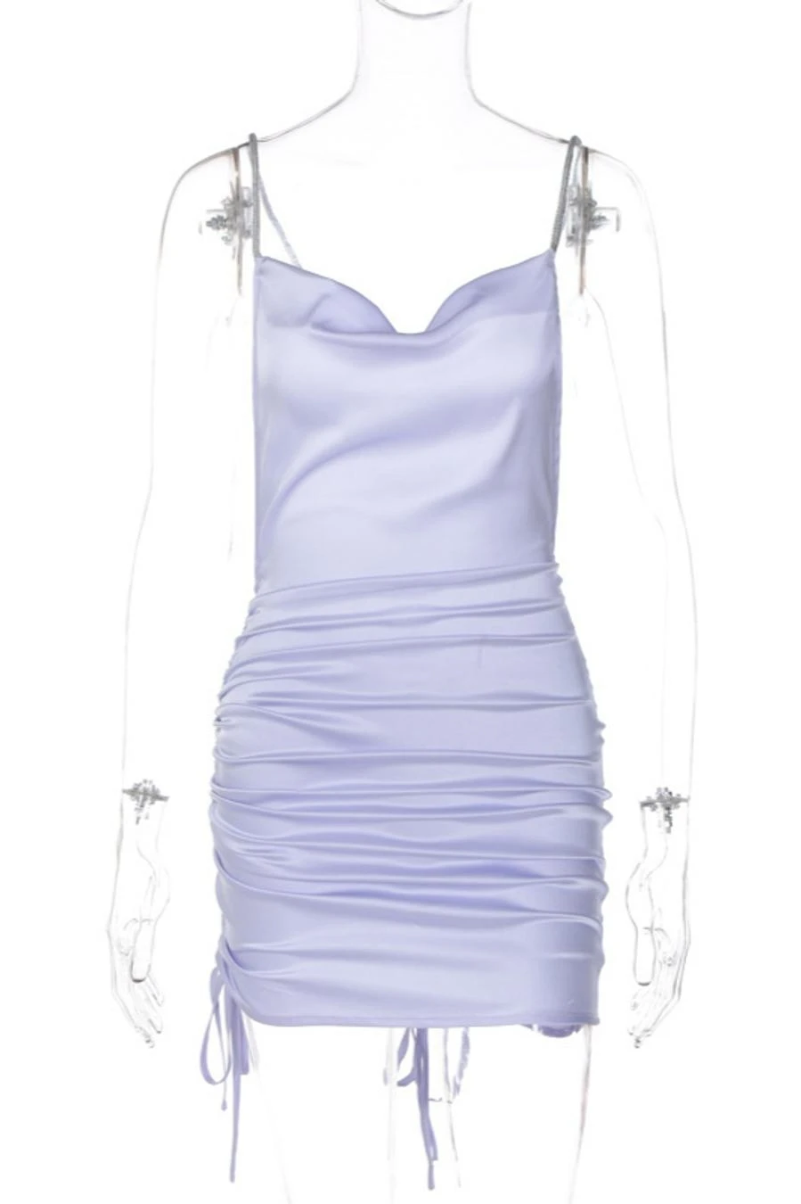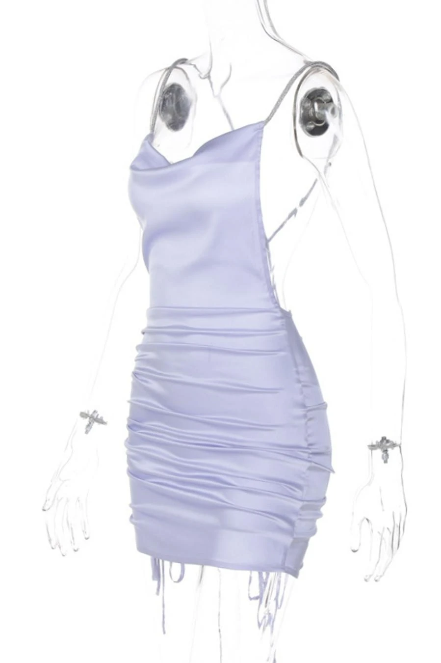 Sexy slight stretch solid satin sling backless drawstring slim mini dress