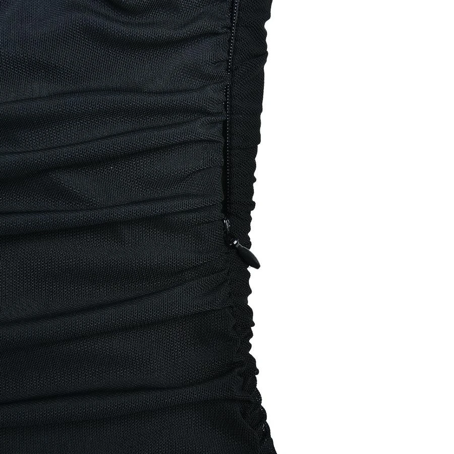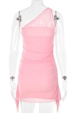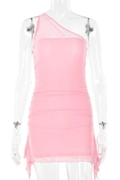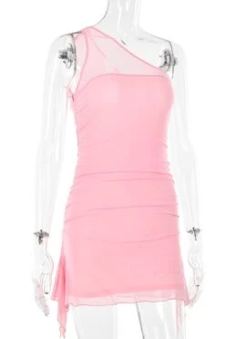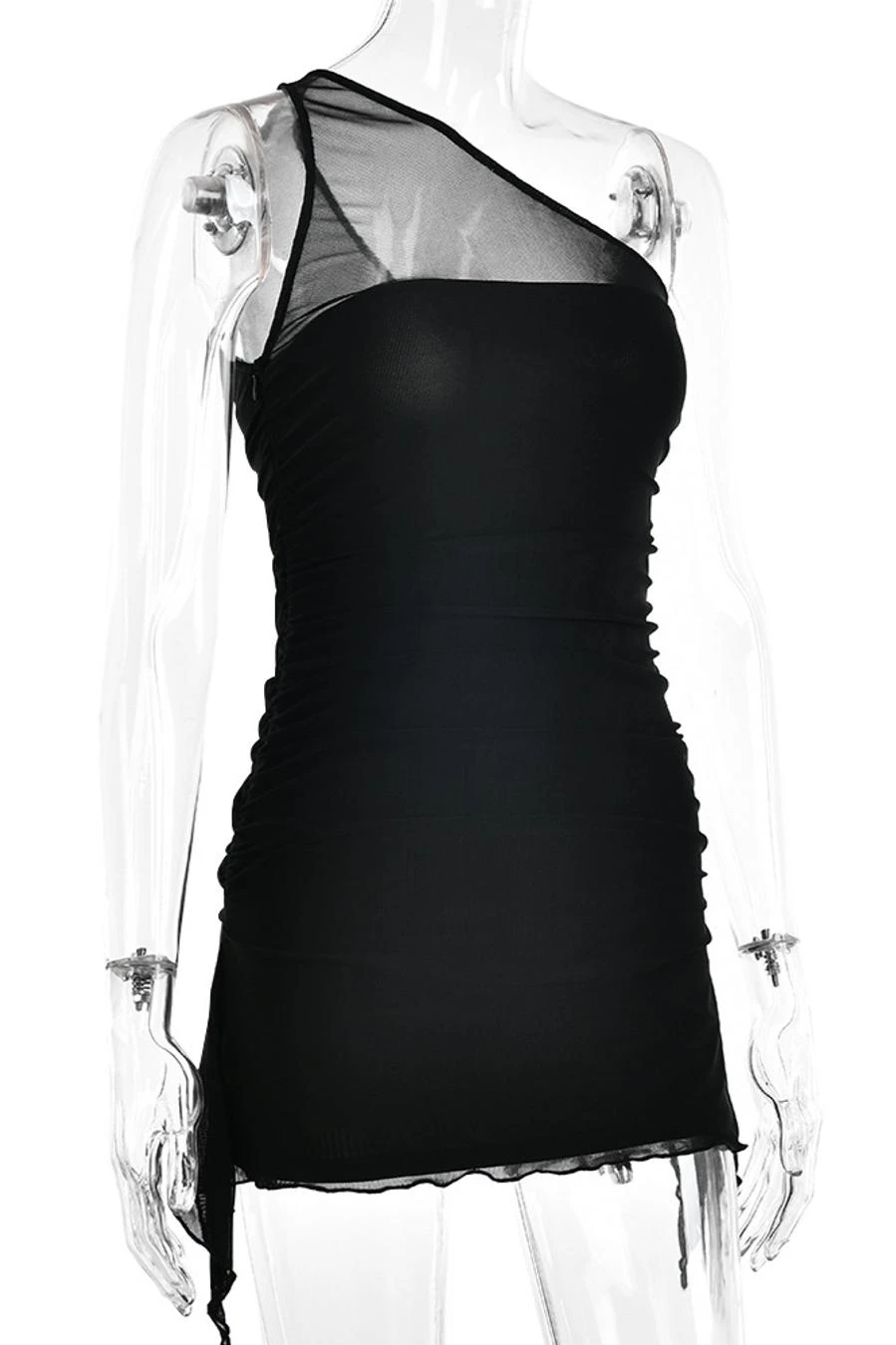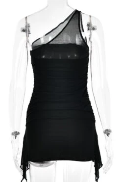 Sexy slight stretch stitching mesh solid color one shoulder mini dress
