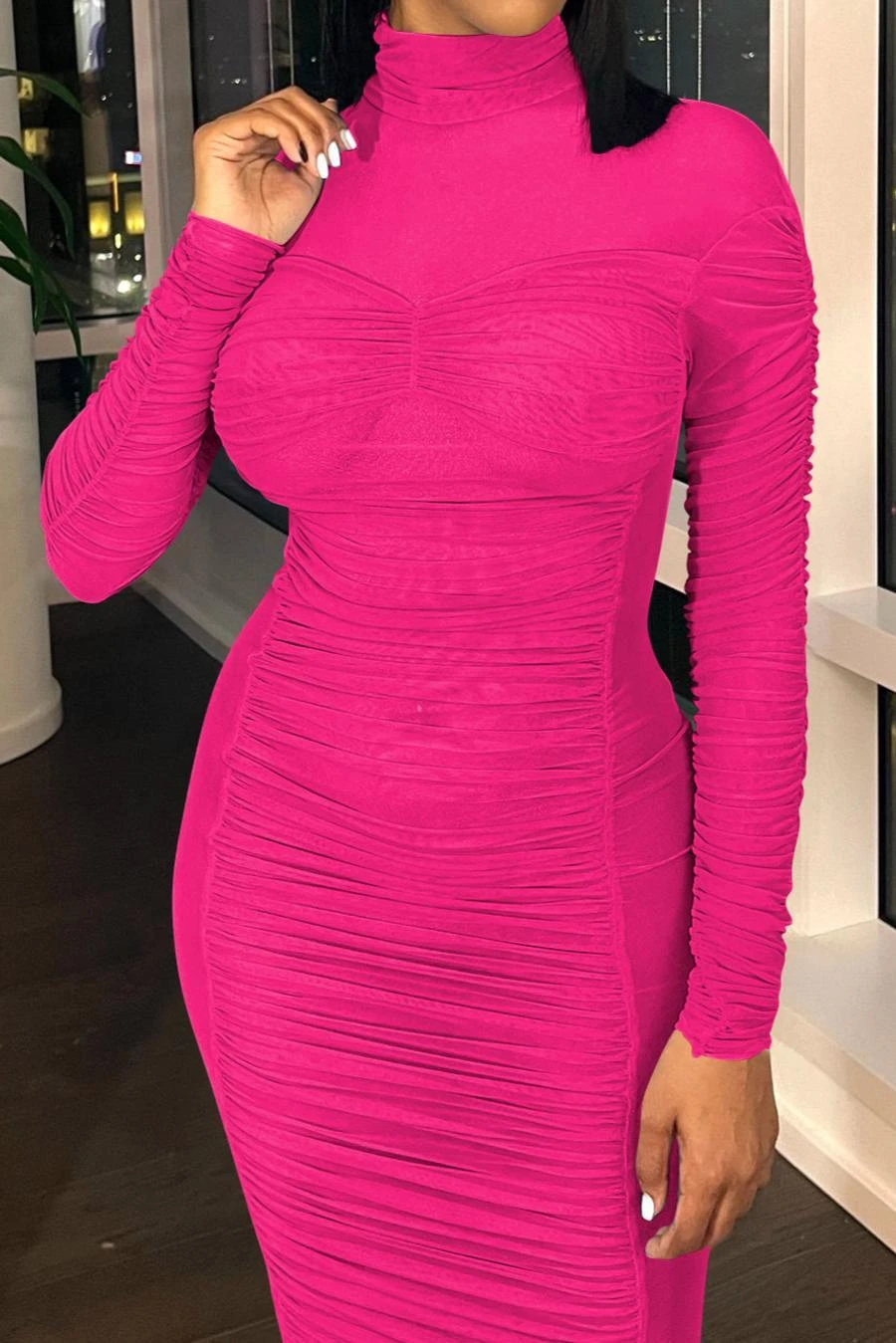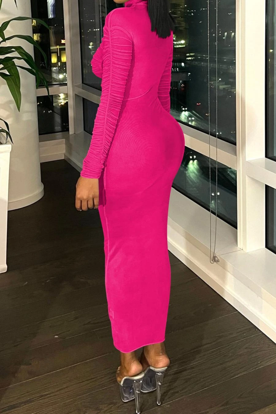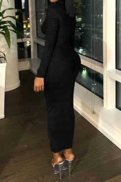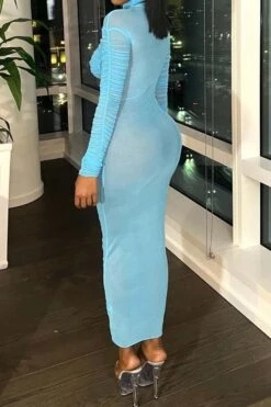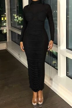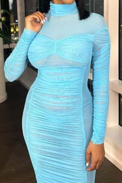 Sexy slight stretch stitching see-through mesh crew neck shirring maxi dress