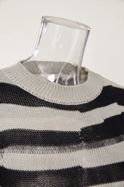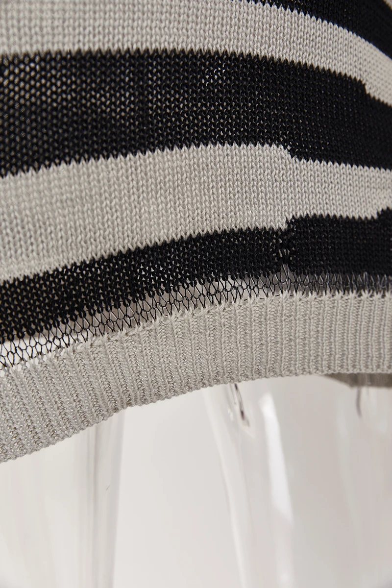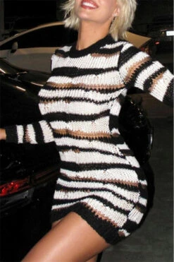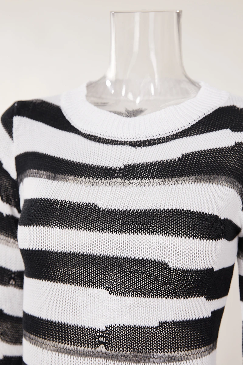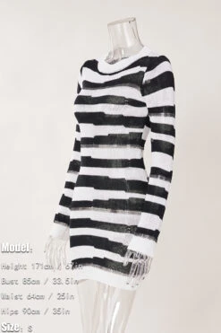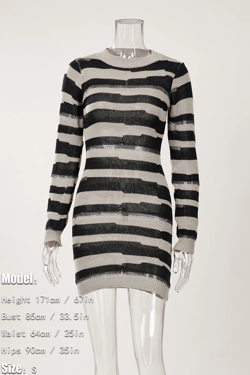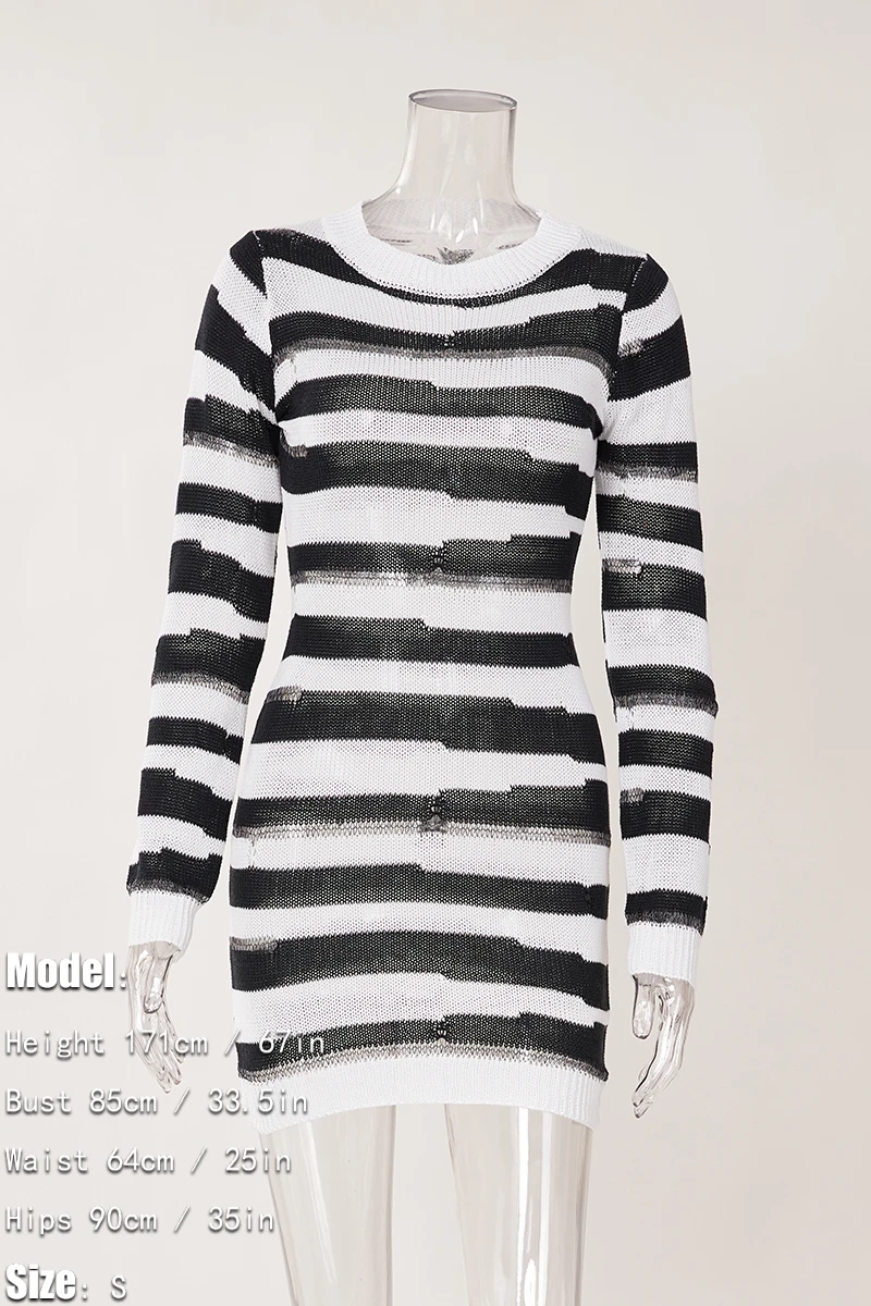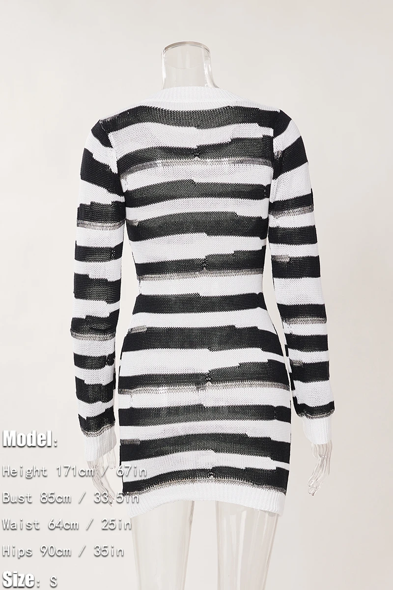 Sexy slight stretch striped hole knitted long-sleeve slim mini dress