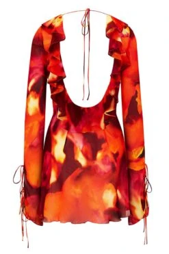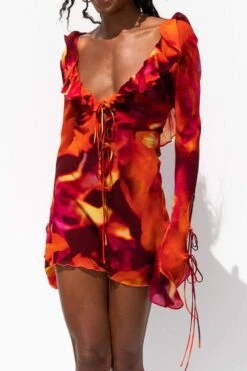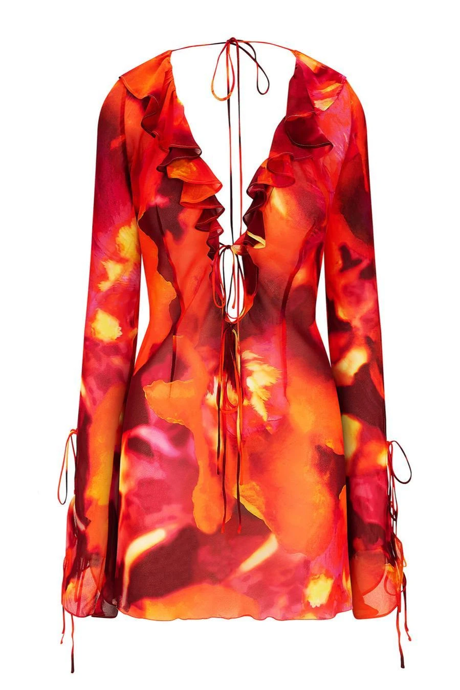 Sexy slight stretch tie-dye v-neck ruffle backless lace-up mini dress