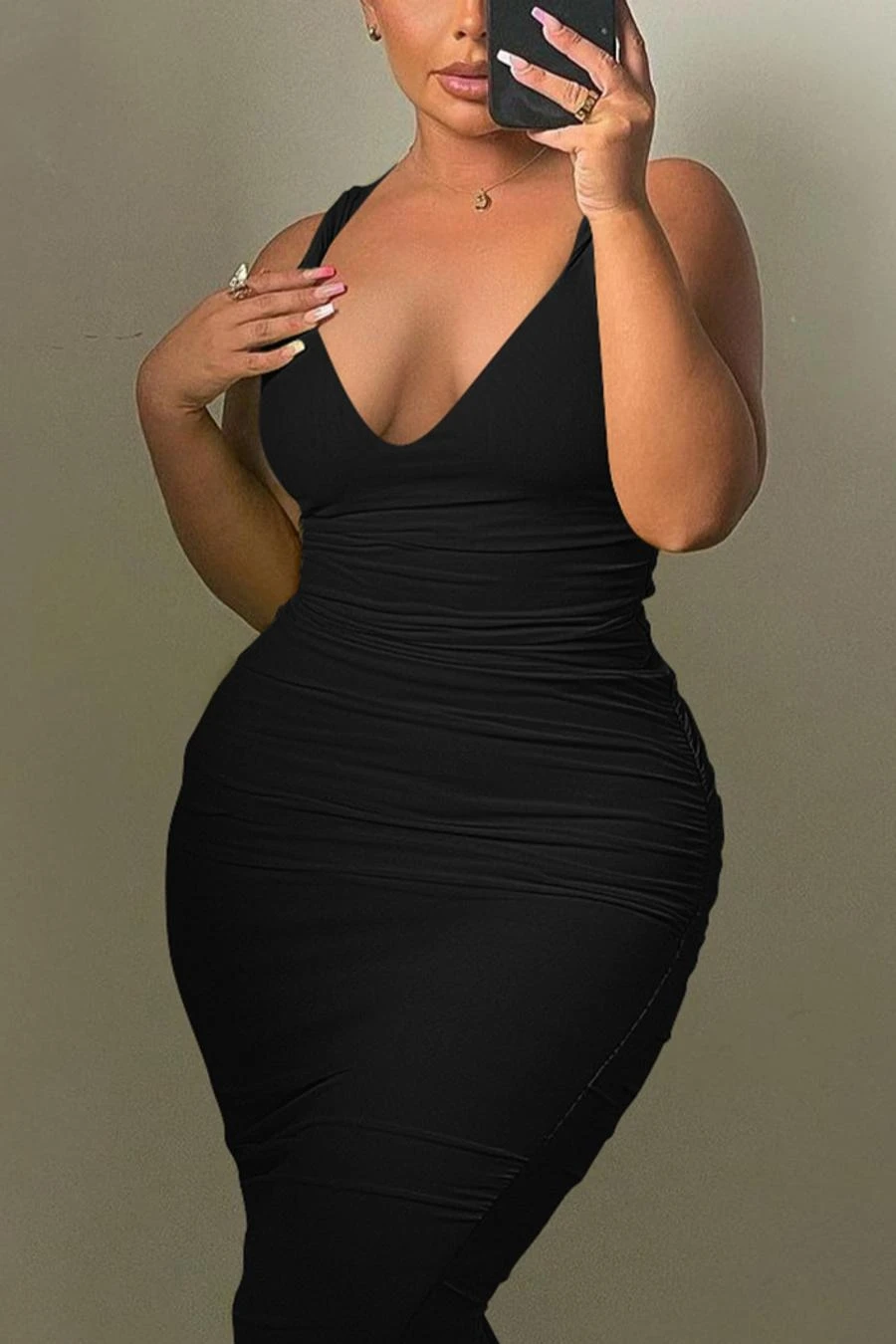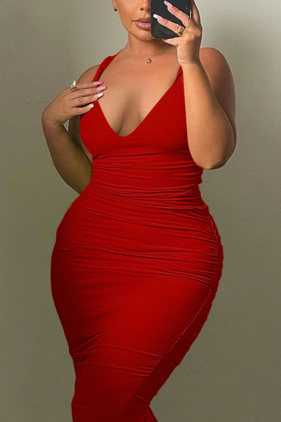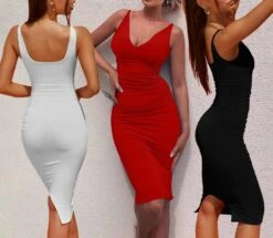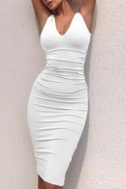Sexy solid color stretch deep-v backless slit bodycon midi dress
