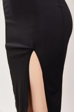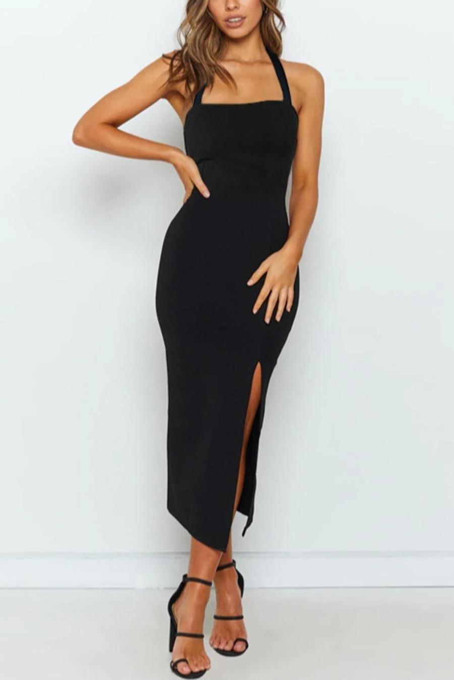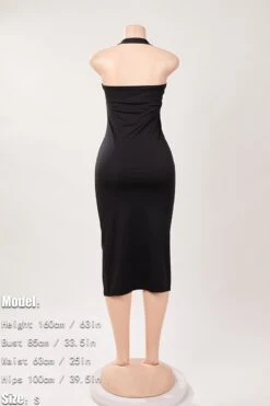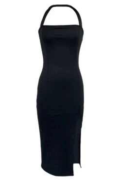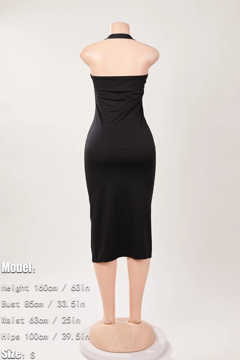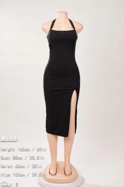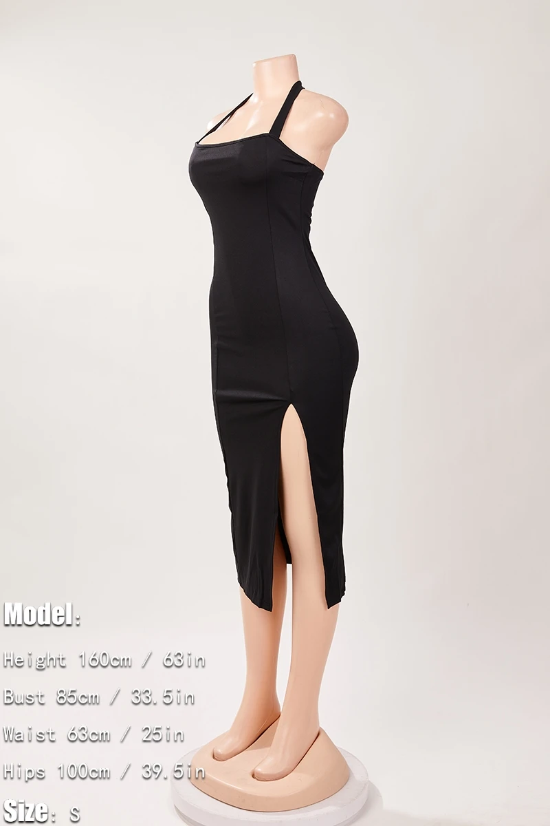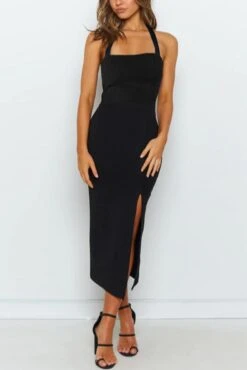Sexy solid color stretch halter-neck backless slit midi dress