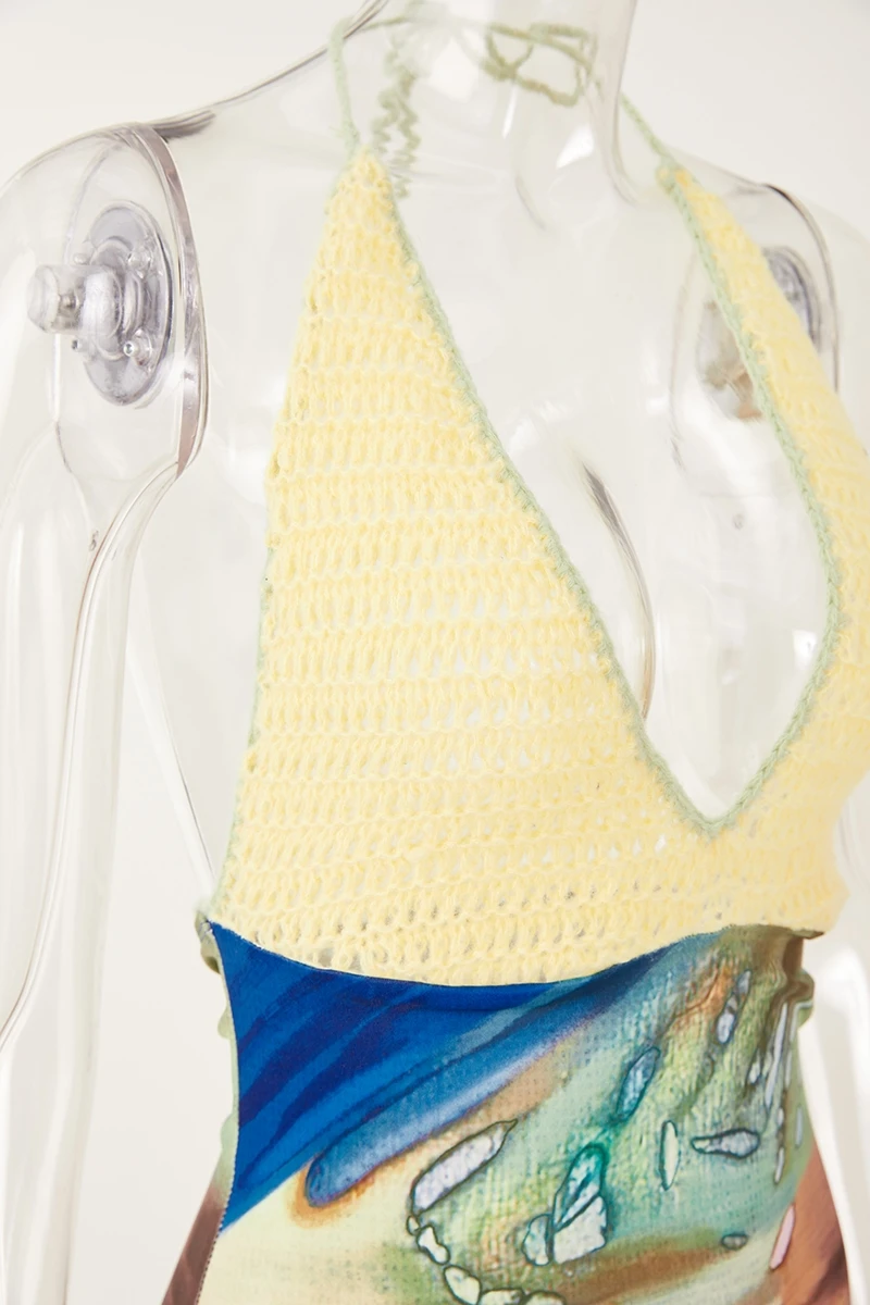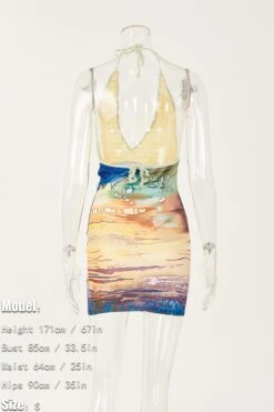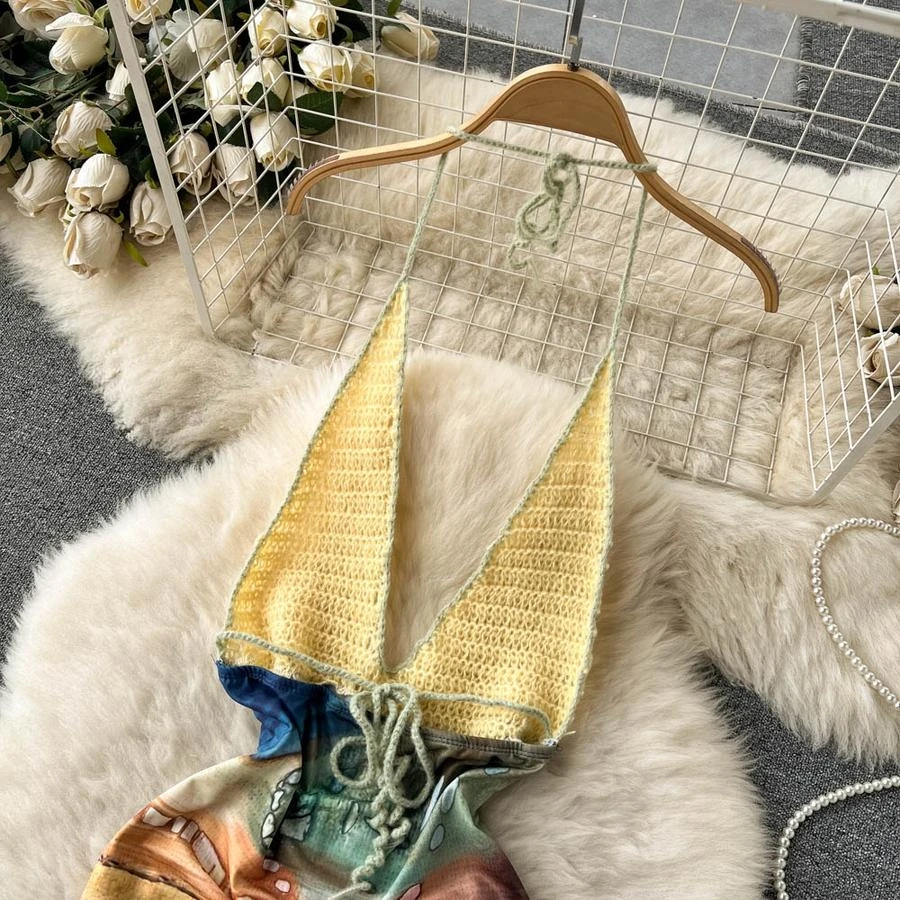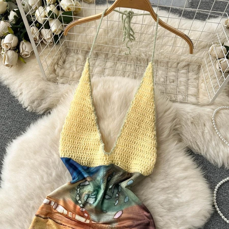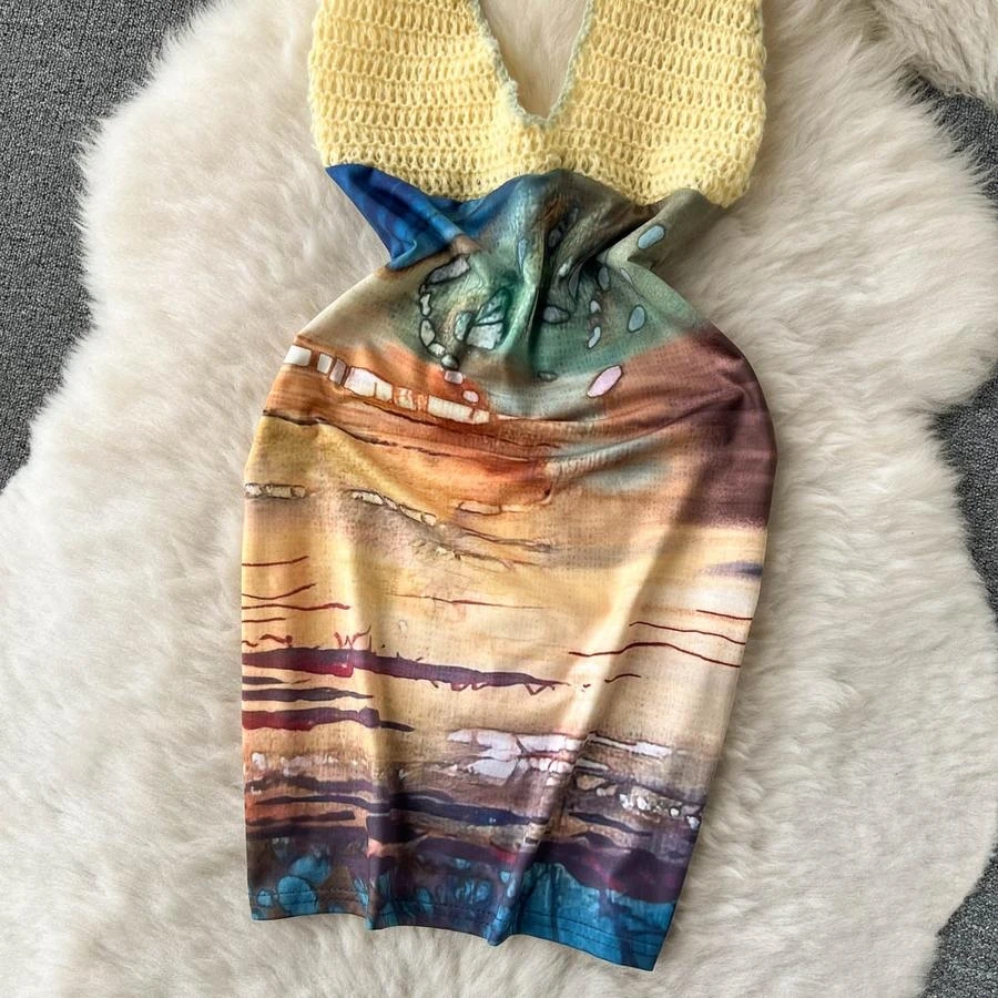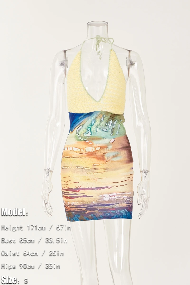 Sexy stretch knitted batch printing halter-neck backless bohemian mini dress
