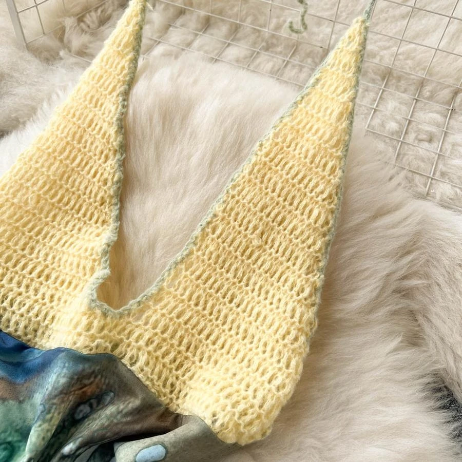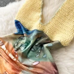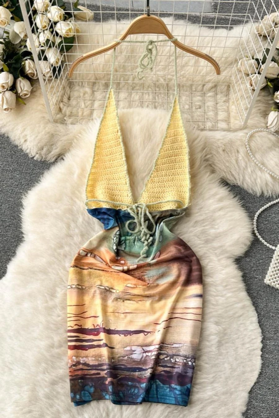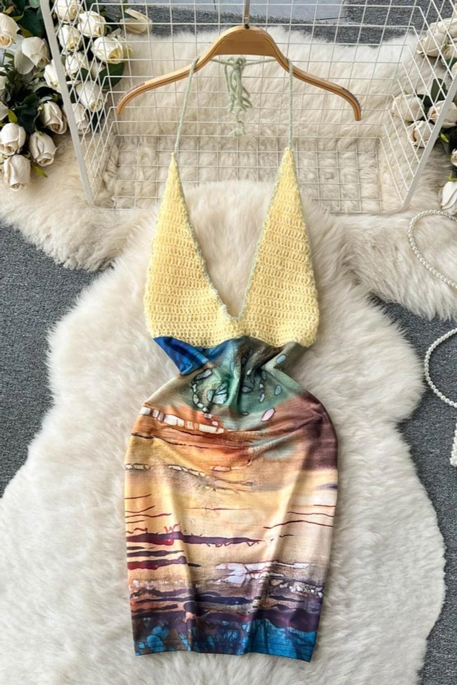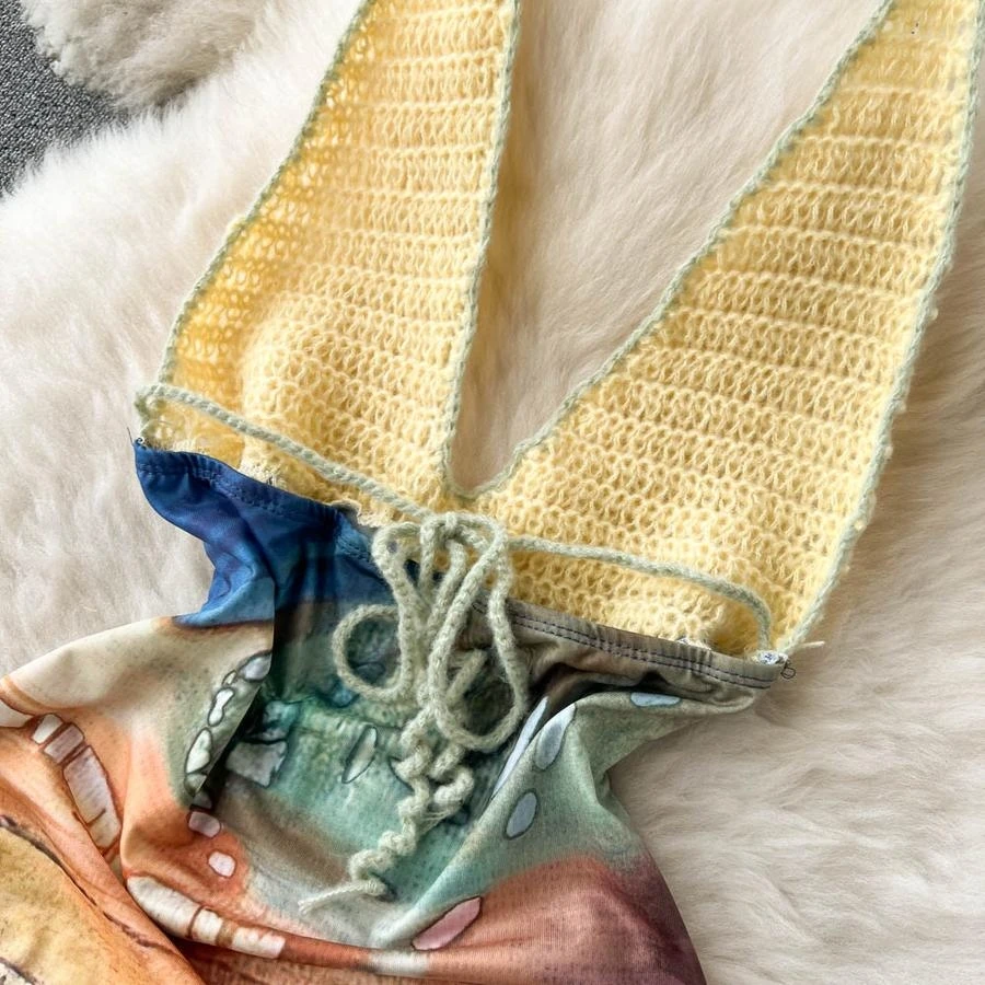 Sexy stretch knitted batch printing halter-neck backless bohemian mini dress