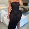 Sexy stretch mesh halter-neck hollow with gloves slim midi dress(no underwear)