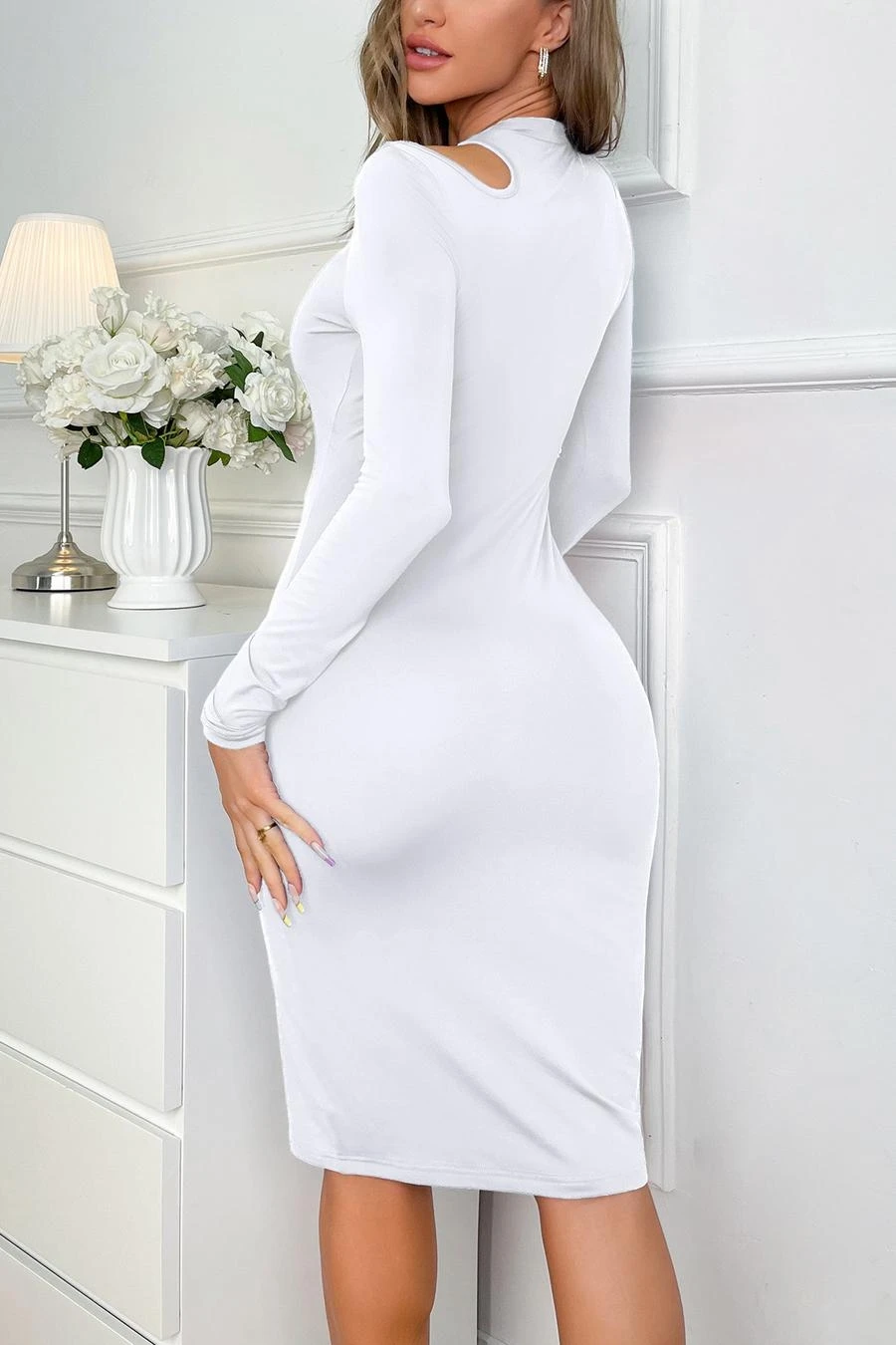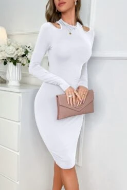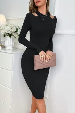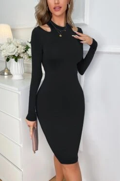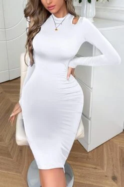 Sexy stretch solid color hollow long sleeve slim midi dress