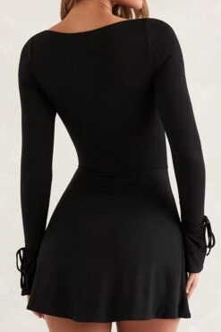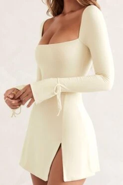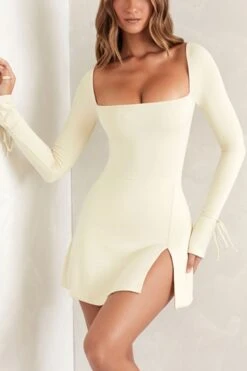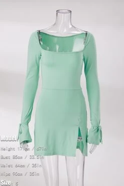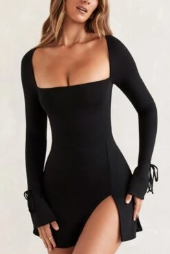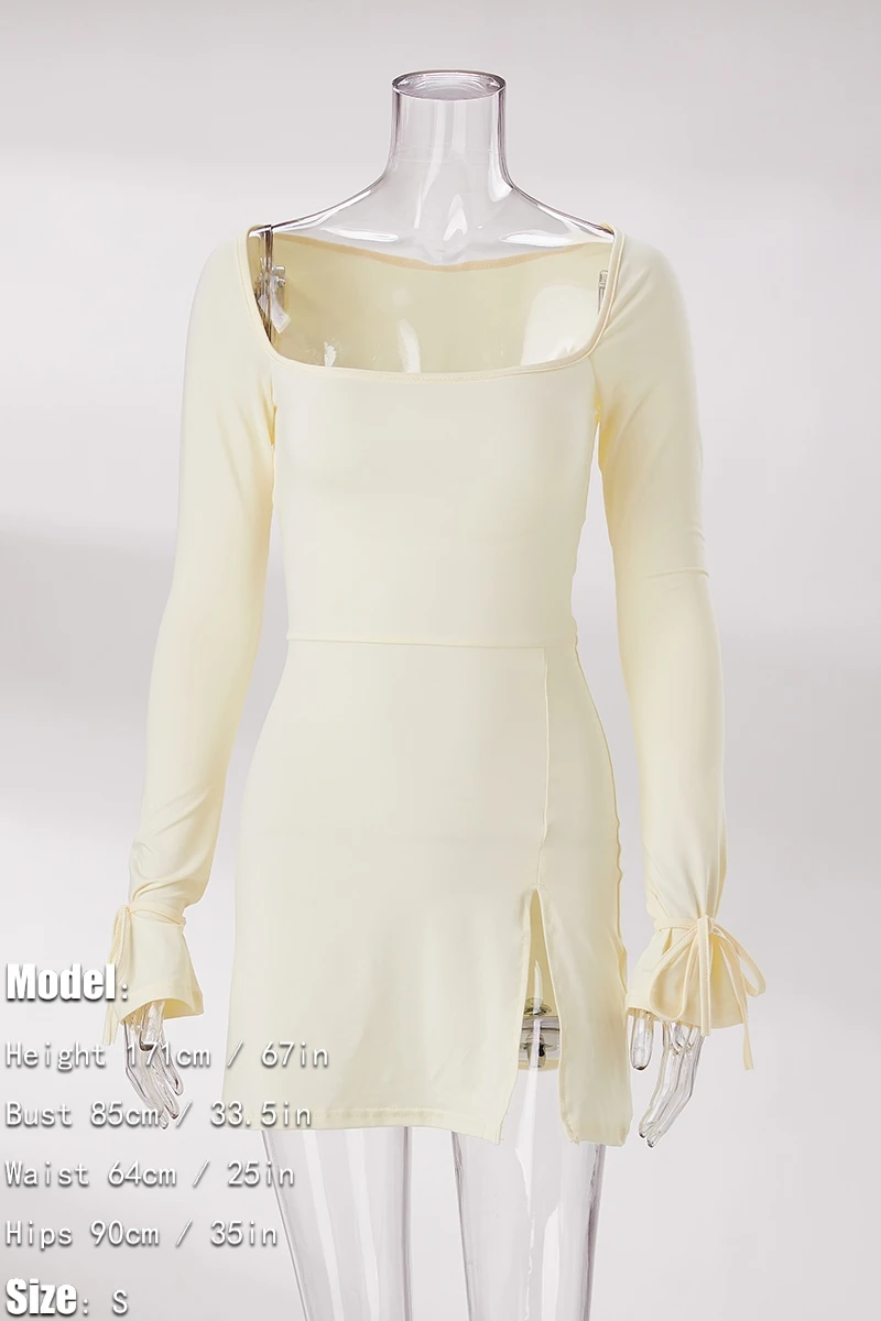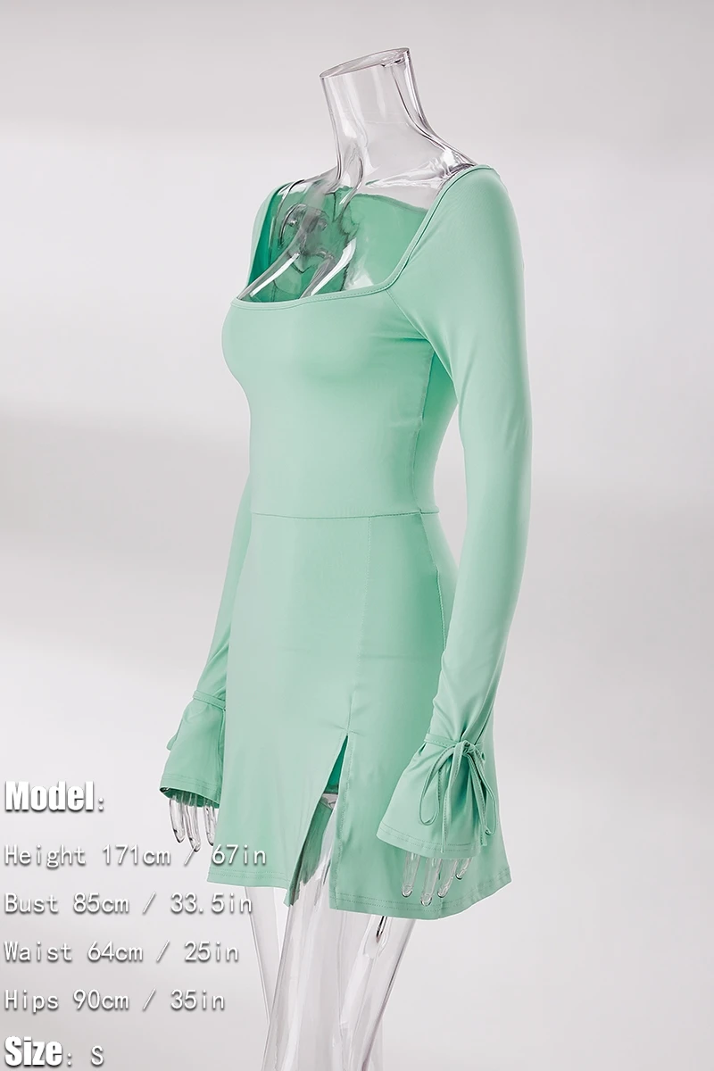 Slight stretch 3 colors solid color square neck slit sexy mini dress