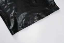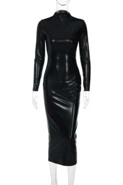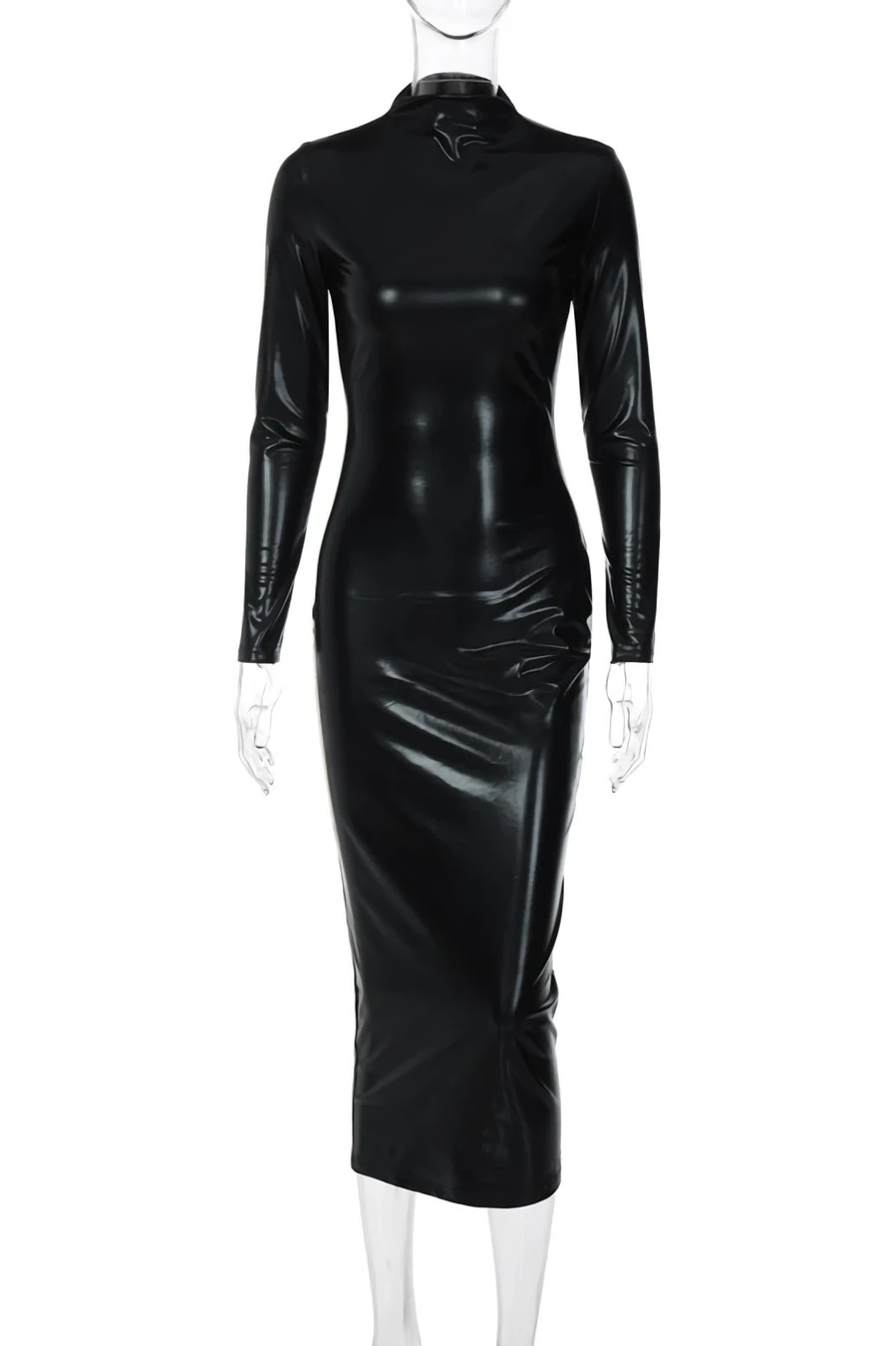 Slight Stretch slim pu solid color long sleeve stylish simple midi dress