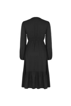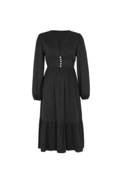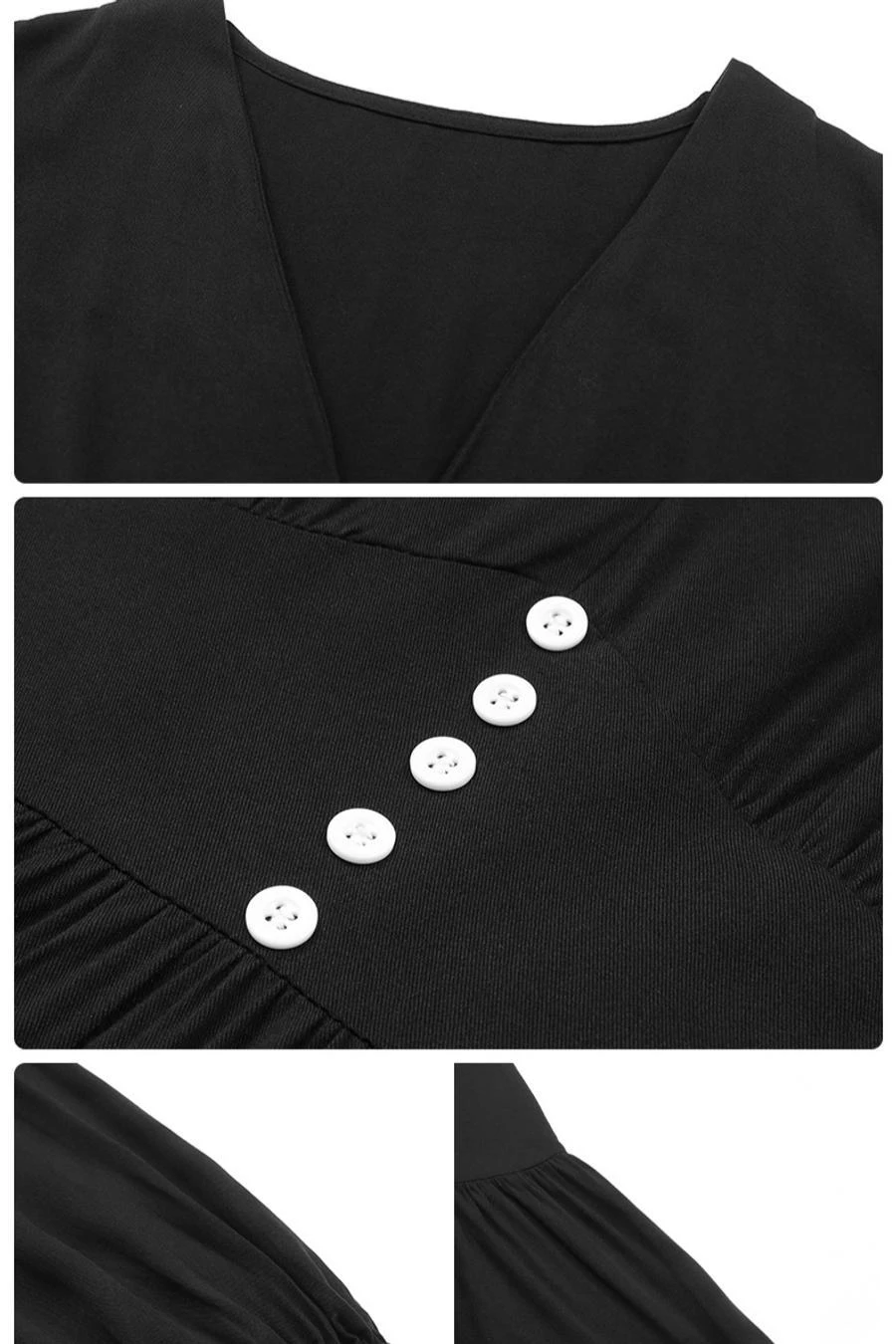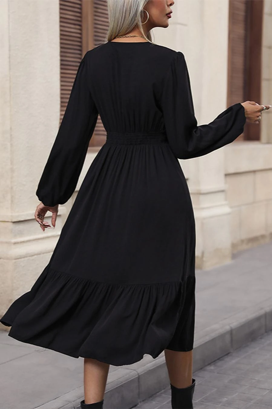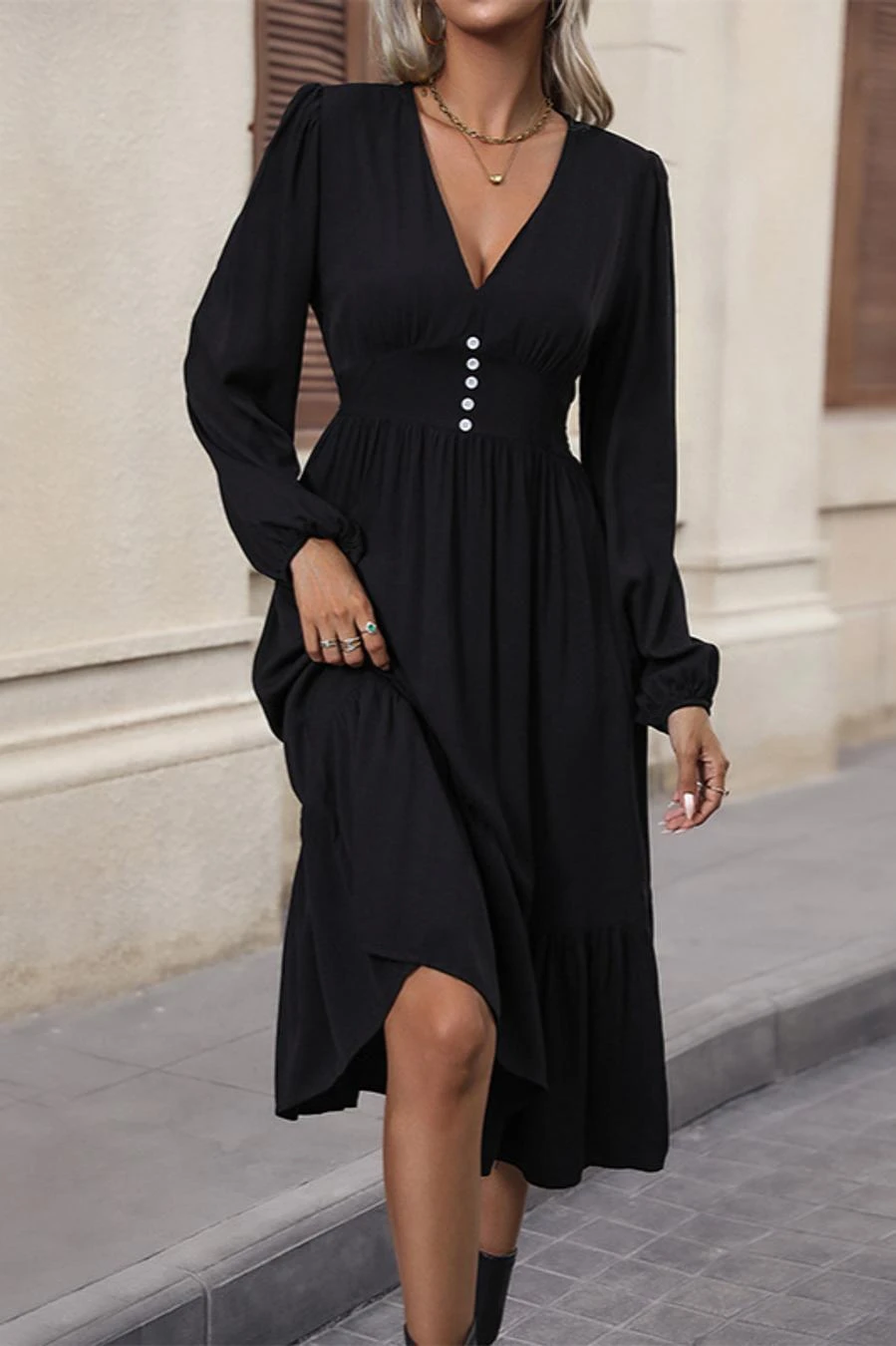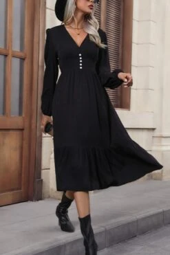 Solid color non-stretch v-neck buttons decor casual midi dress