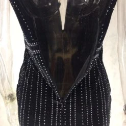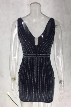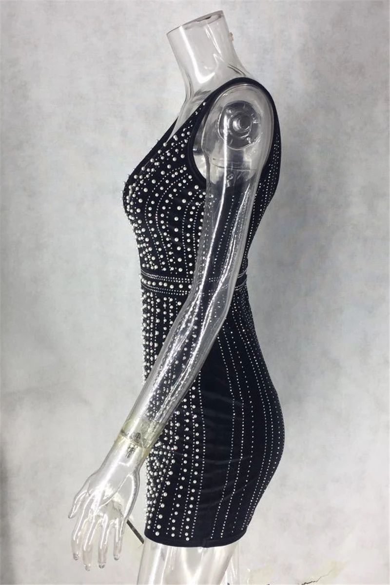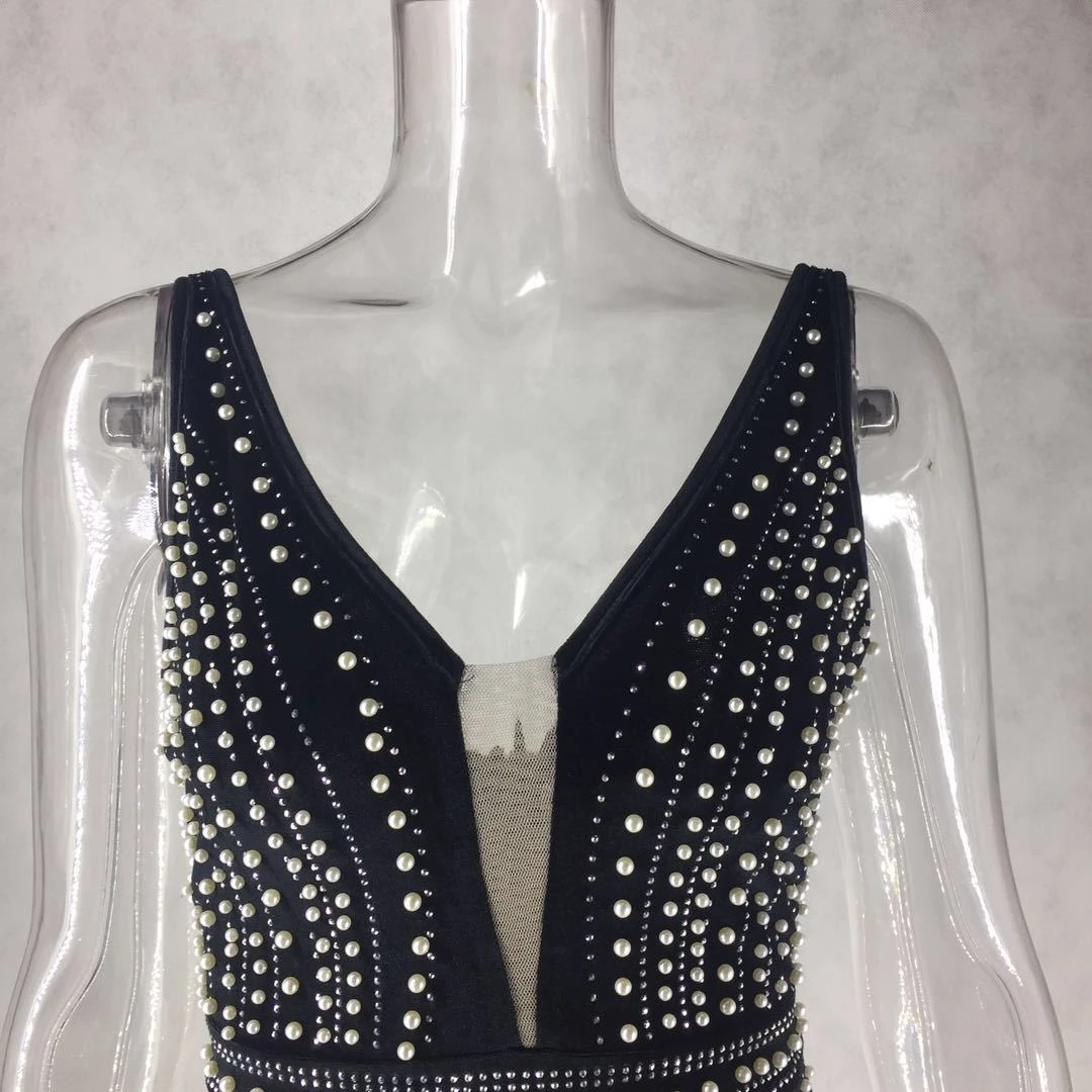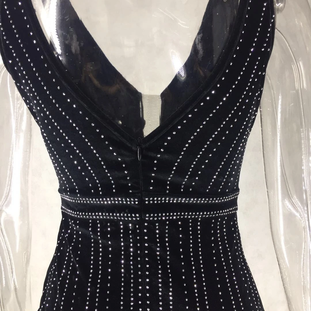 Spring new mesh spliced stretch deep V rhinestones decorated back zip-up sexy elegant dress