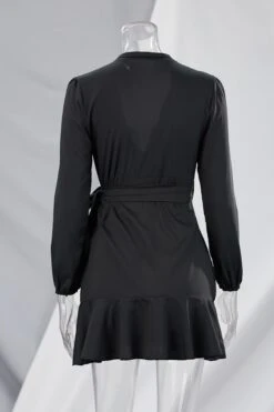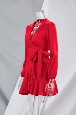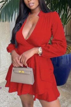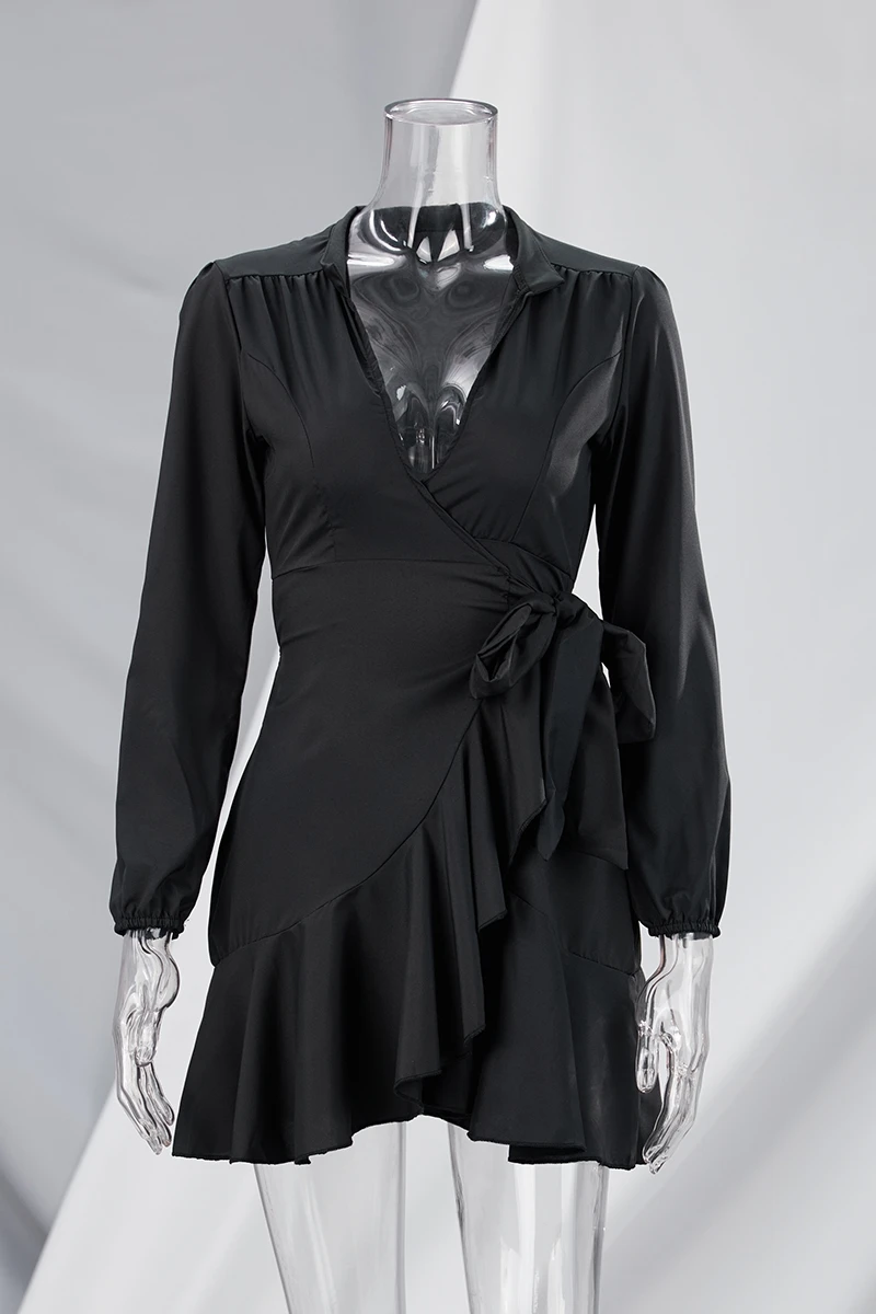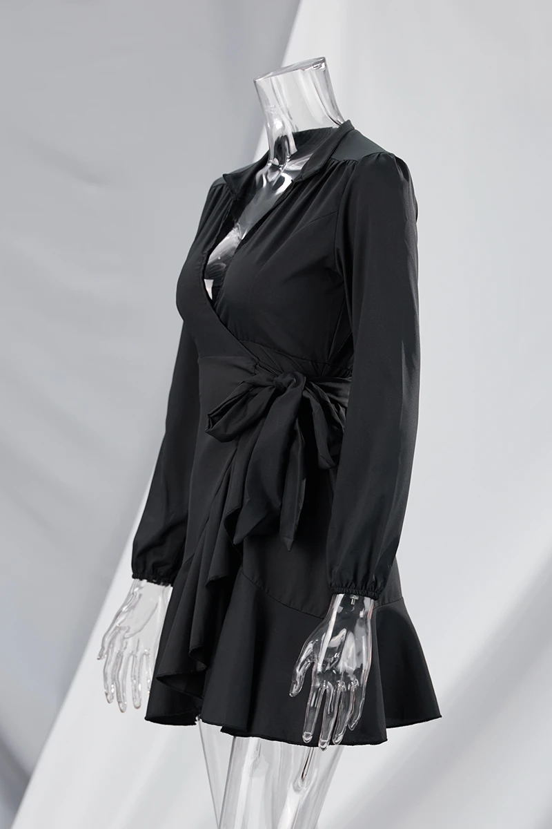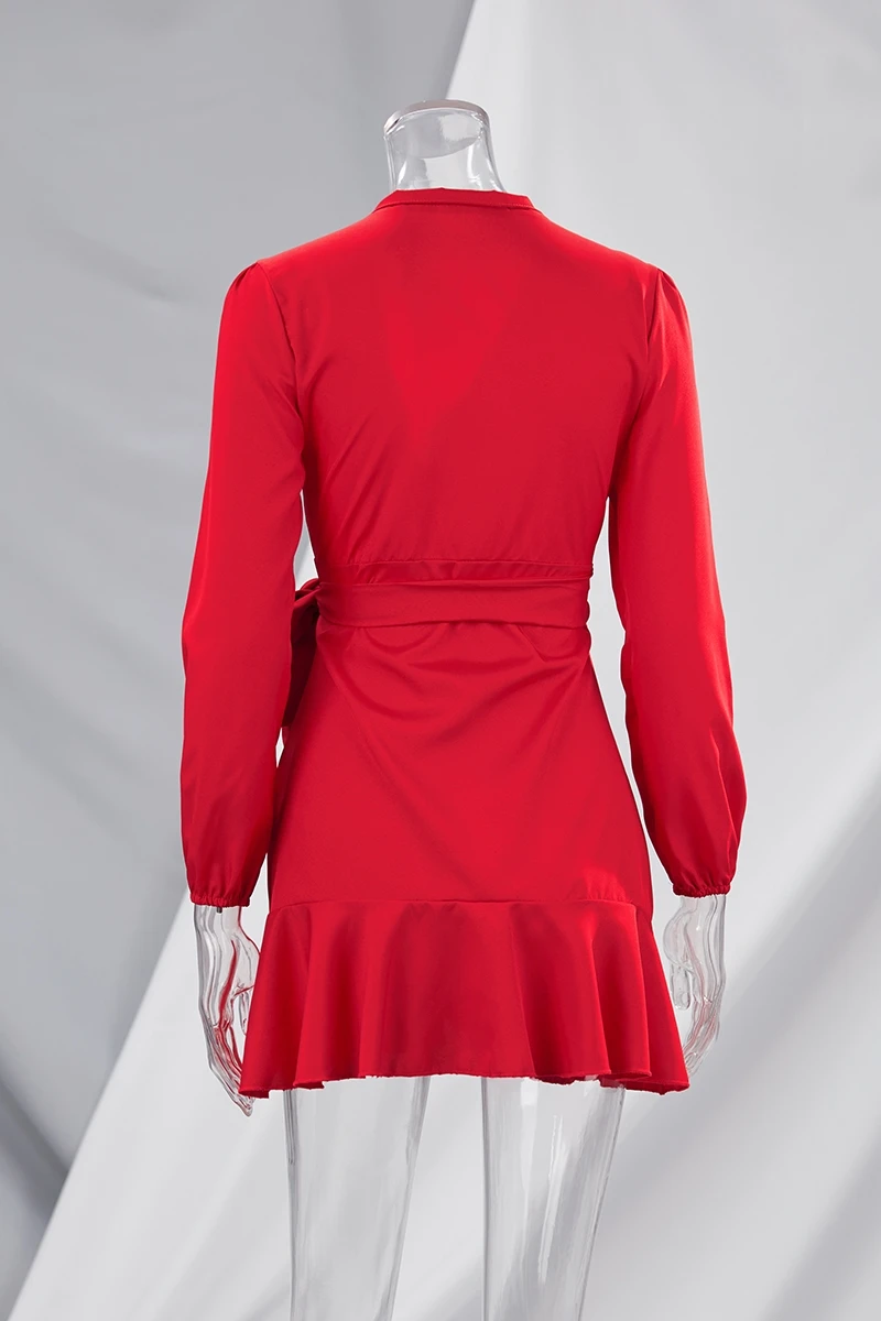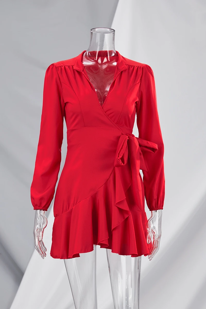 Spring new plus size solid color inelastic deep v tie-waist ruffle stylish mini dress