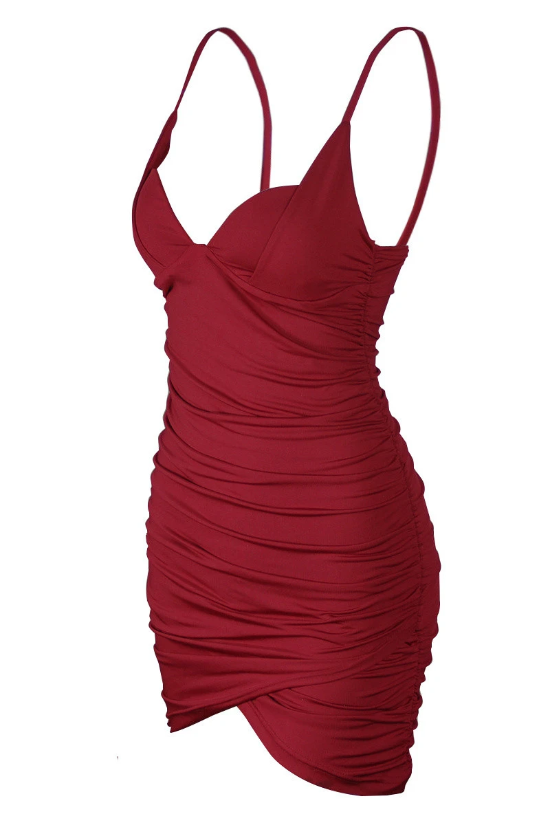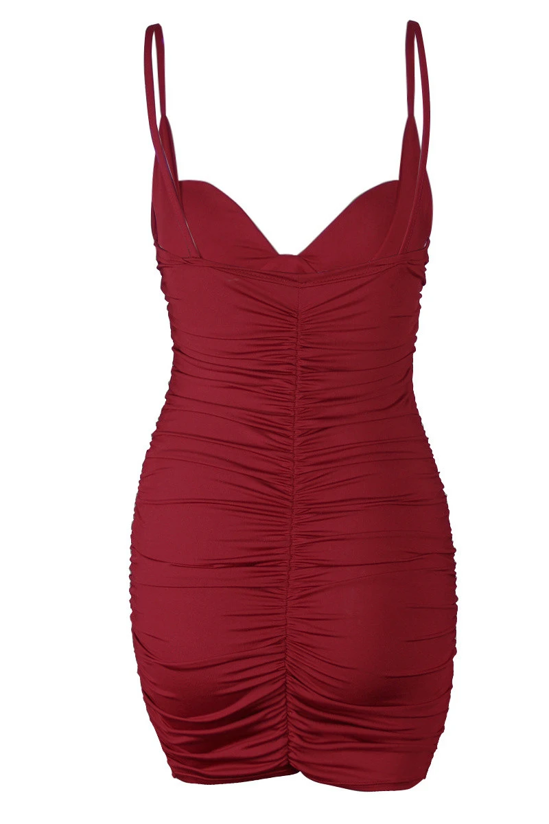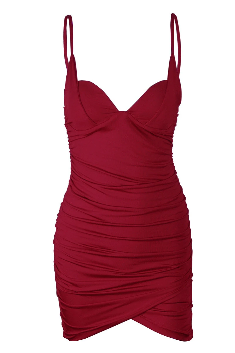 Spring new solid color padded stretch sling pleated sexy dress