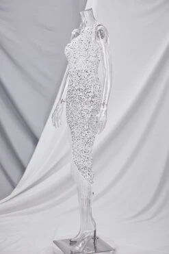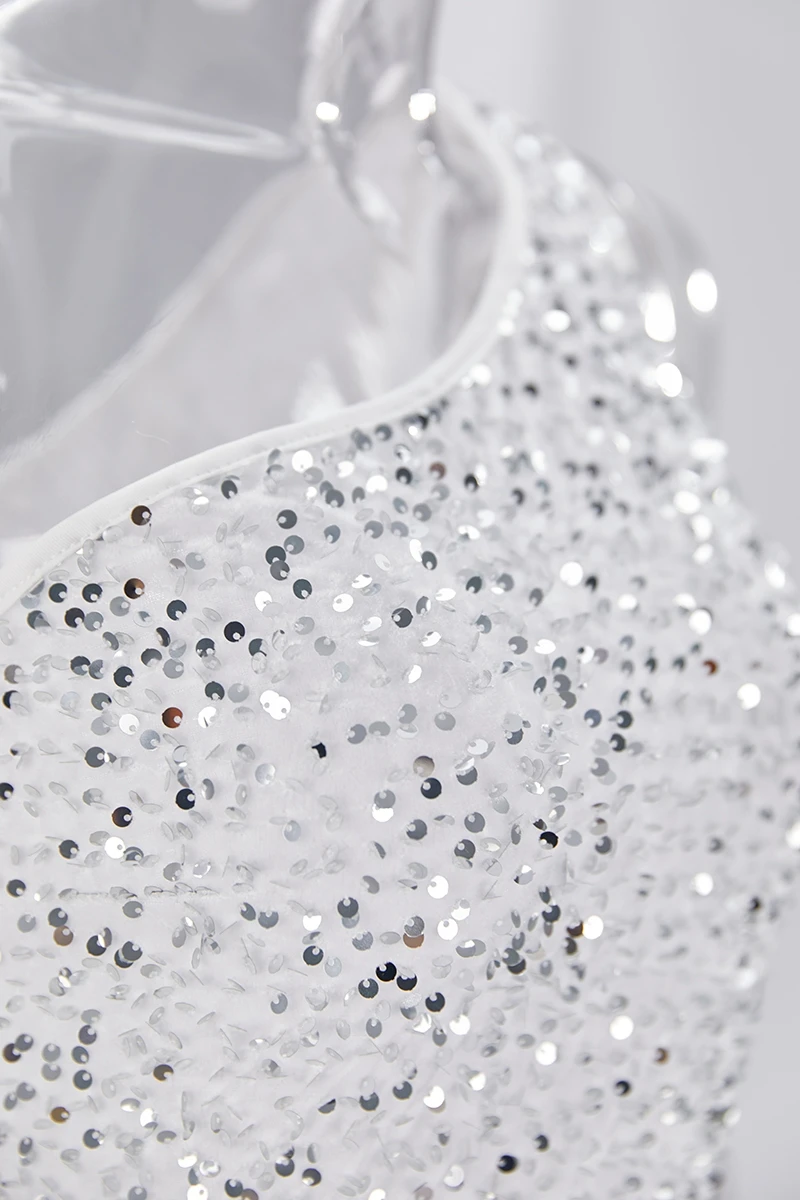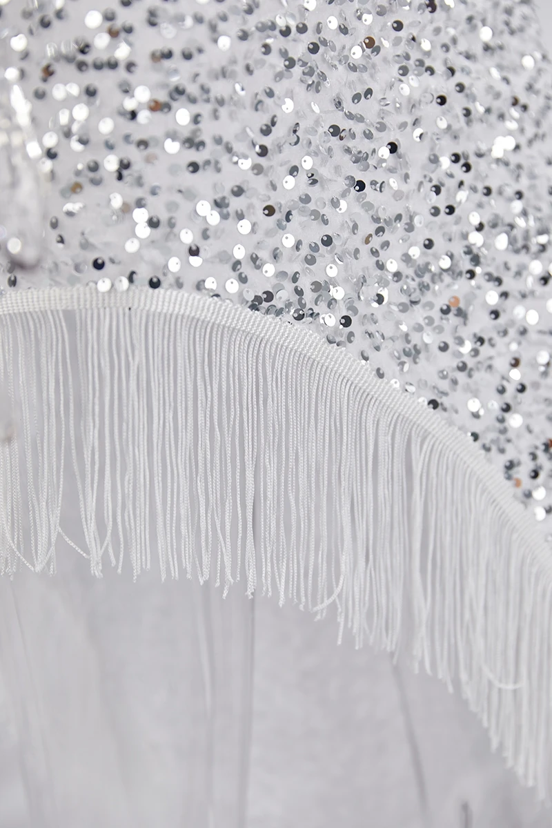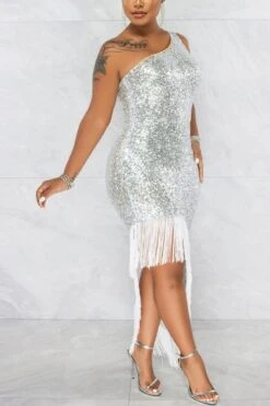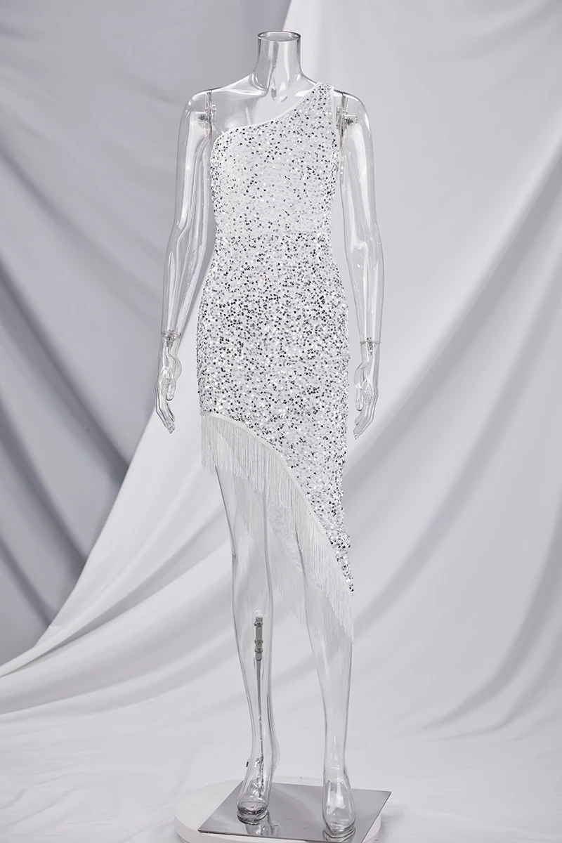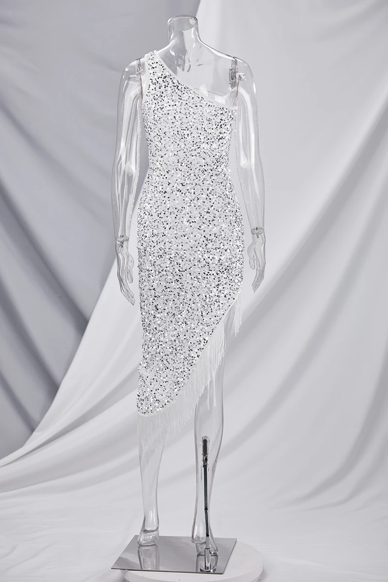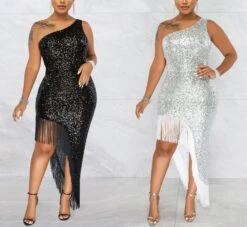 Spring new stylish sequin one-shoulder slit irregular fringe plus size stretch sexy maxi dress