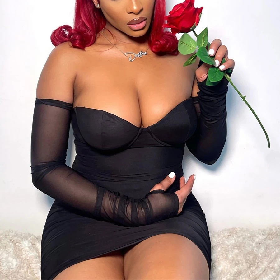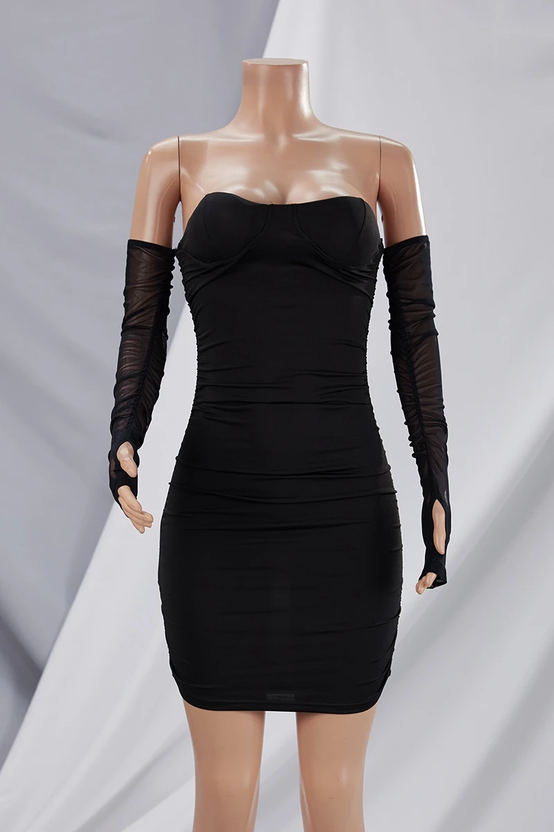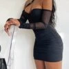 Spring new stylish simple mesh see-through patchwork stretch slim thumb hole with padded strapless sexy mini dress