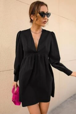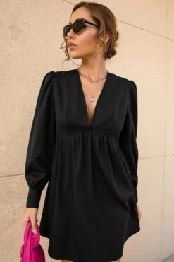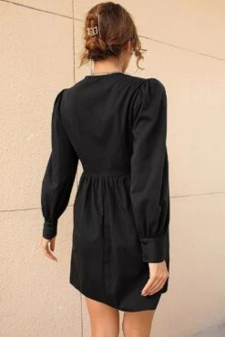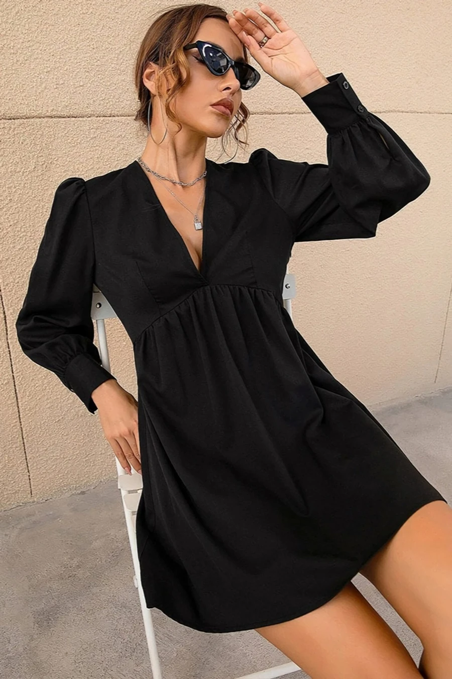 Spring new stylish solid color inelastic v-neck puffed sleeves button shirring casual mini dress