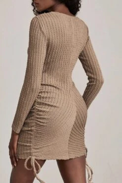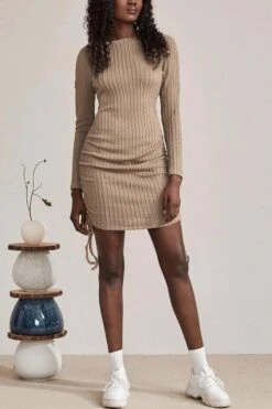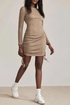 Spring new stylish solid color stretch long sleeves drawstring slim sexy mini dress