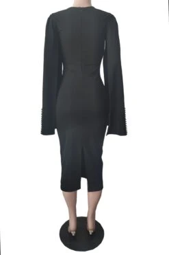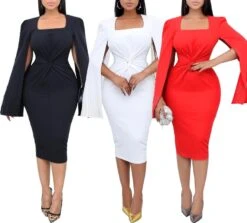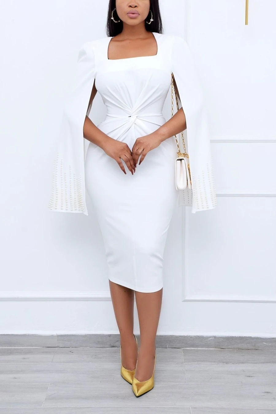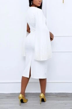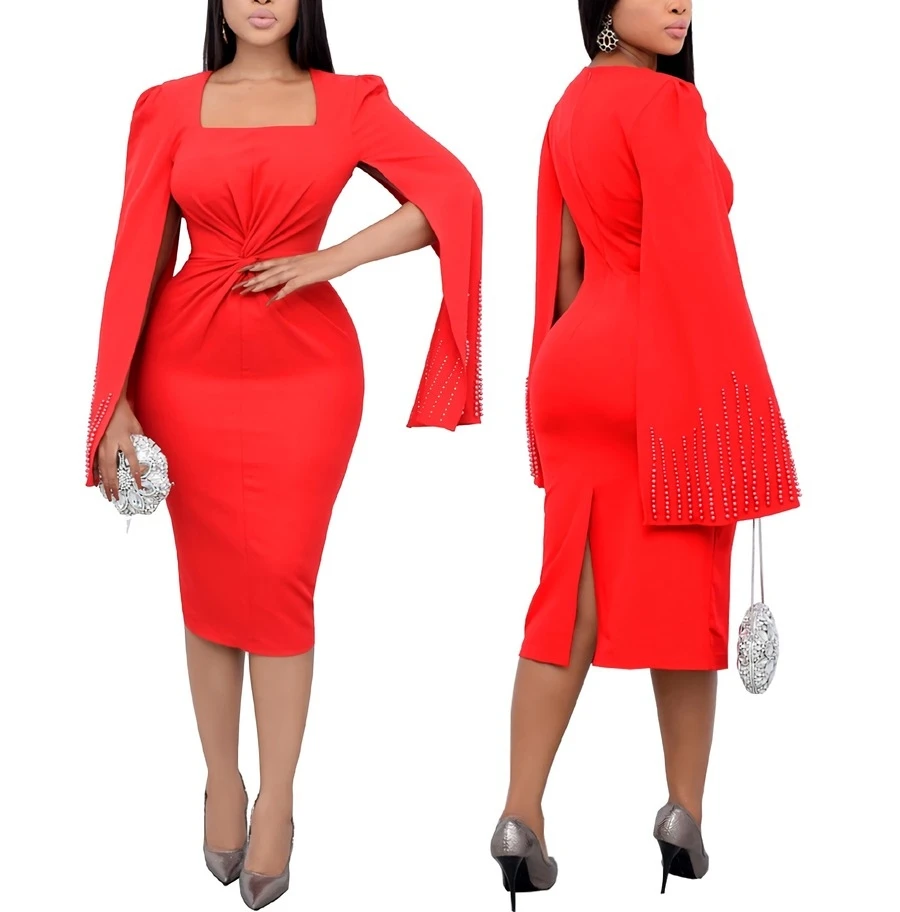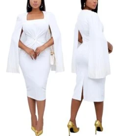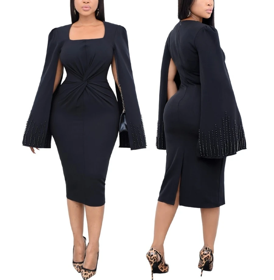 Spring new stylish solid color stretch slit plus size pearl pleated casual midi dress