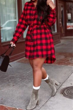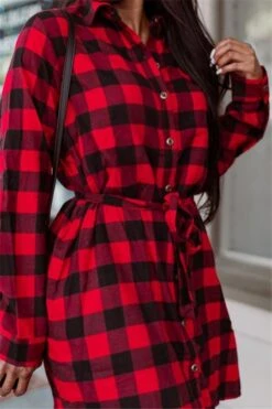 Stylish classical red latticed single-breasted turndown collar dress with belt