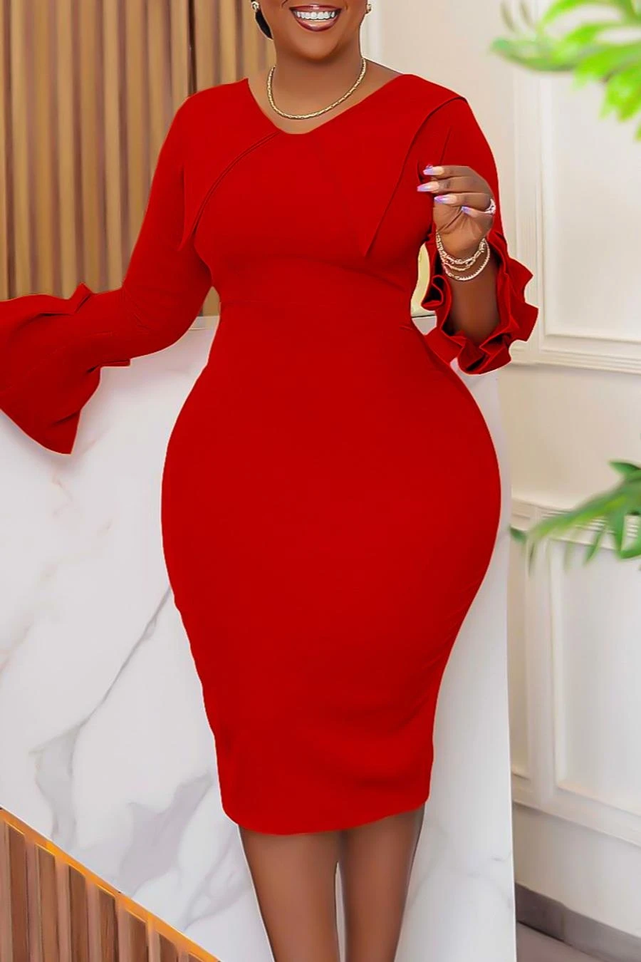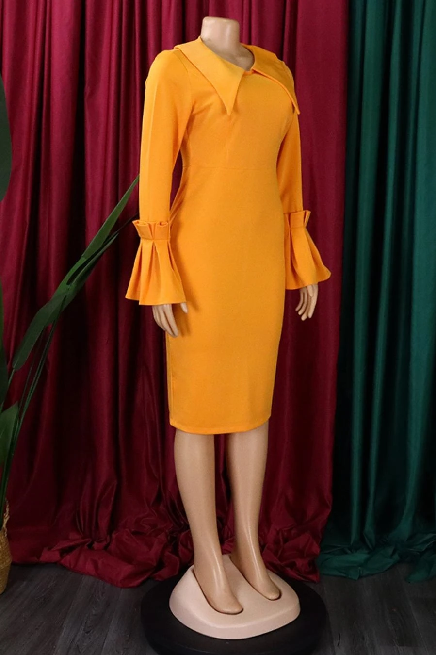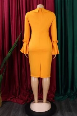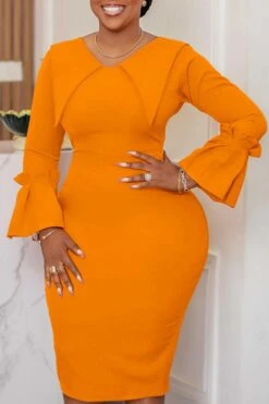 Stylish plus size slight stretch orange bodycon office lady midi dress