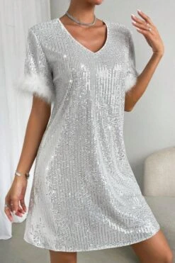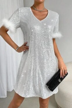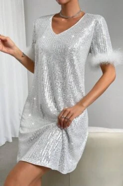 stylish slight stretch sequin decor v-neck fuzzy cuff mini dress