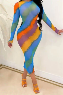 Summer autumn new tie-dye see through mesh stretch sexy bodycon midi dress (Without lining))