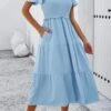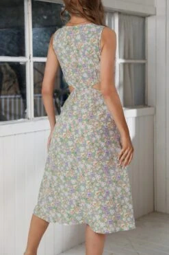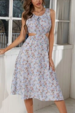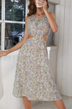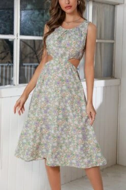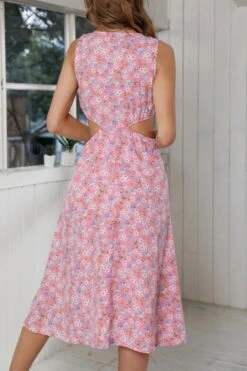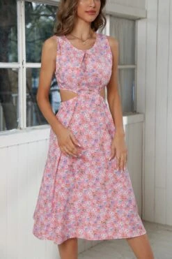 Summer new 3 colors chiffon floral batch printing micro-elastic strappy hollow shirring swing stylish bohemian midi dress