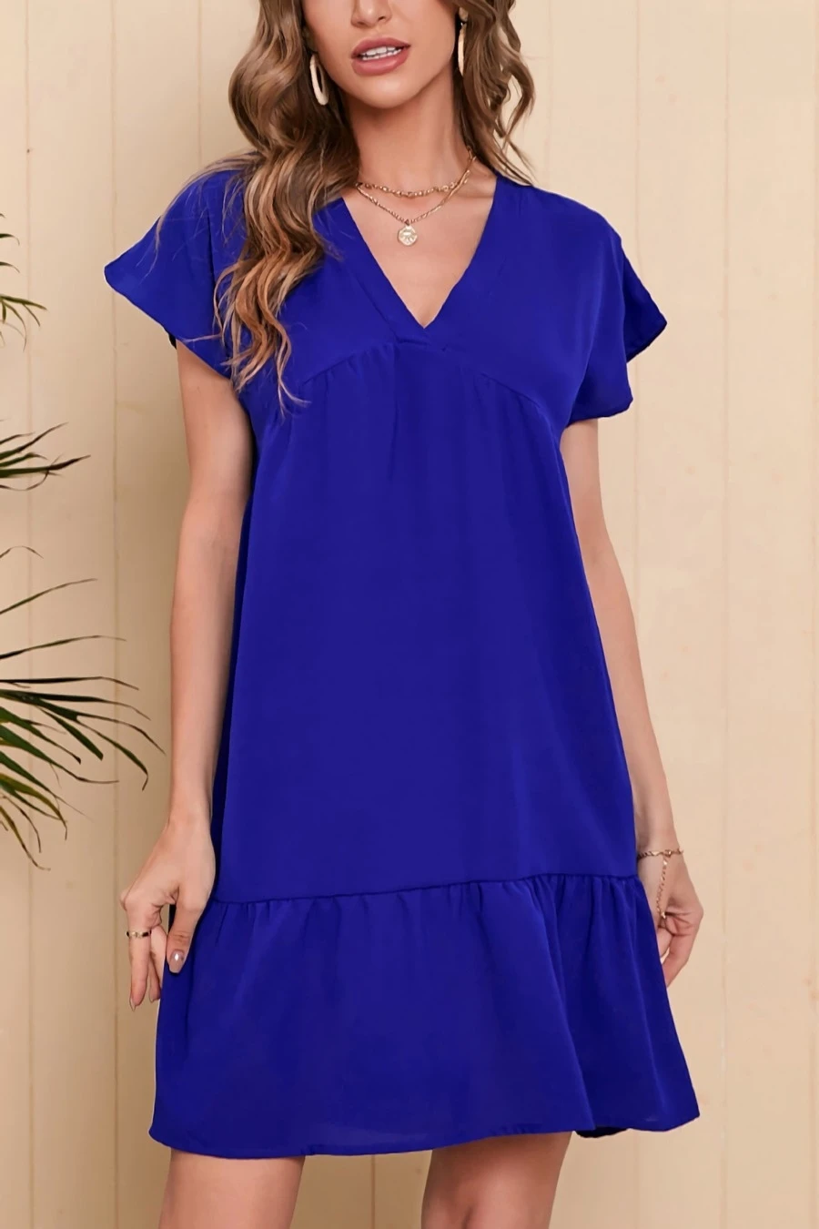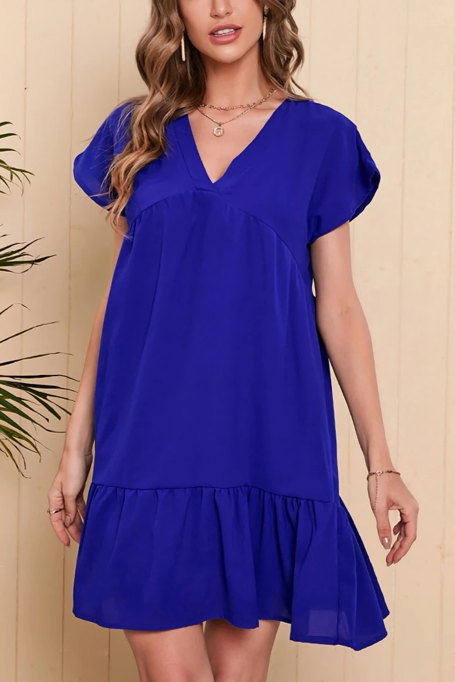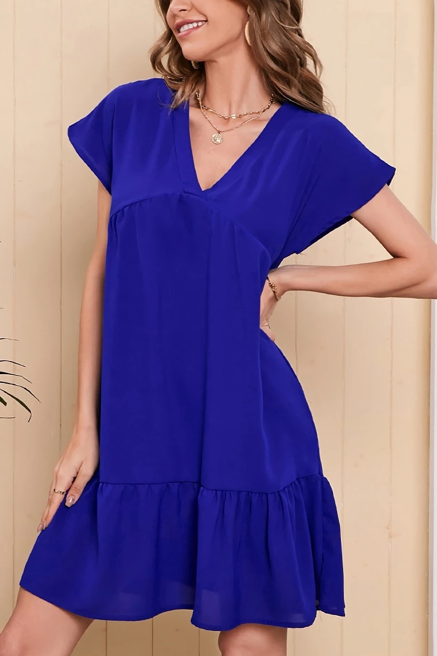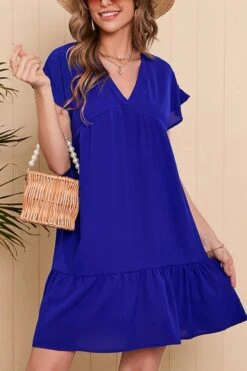 Summer new 4 colors solid color chiffonmesh patchwork inelastic v-neck ruffle shirring swing classic stylish mini dress