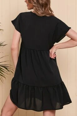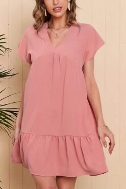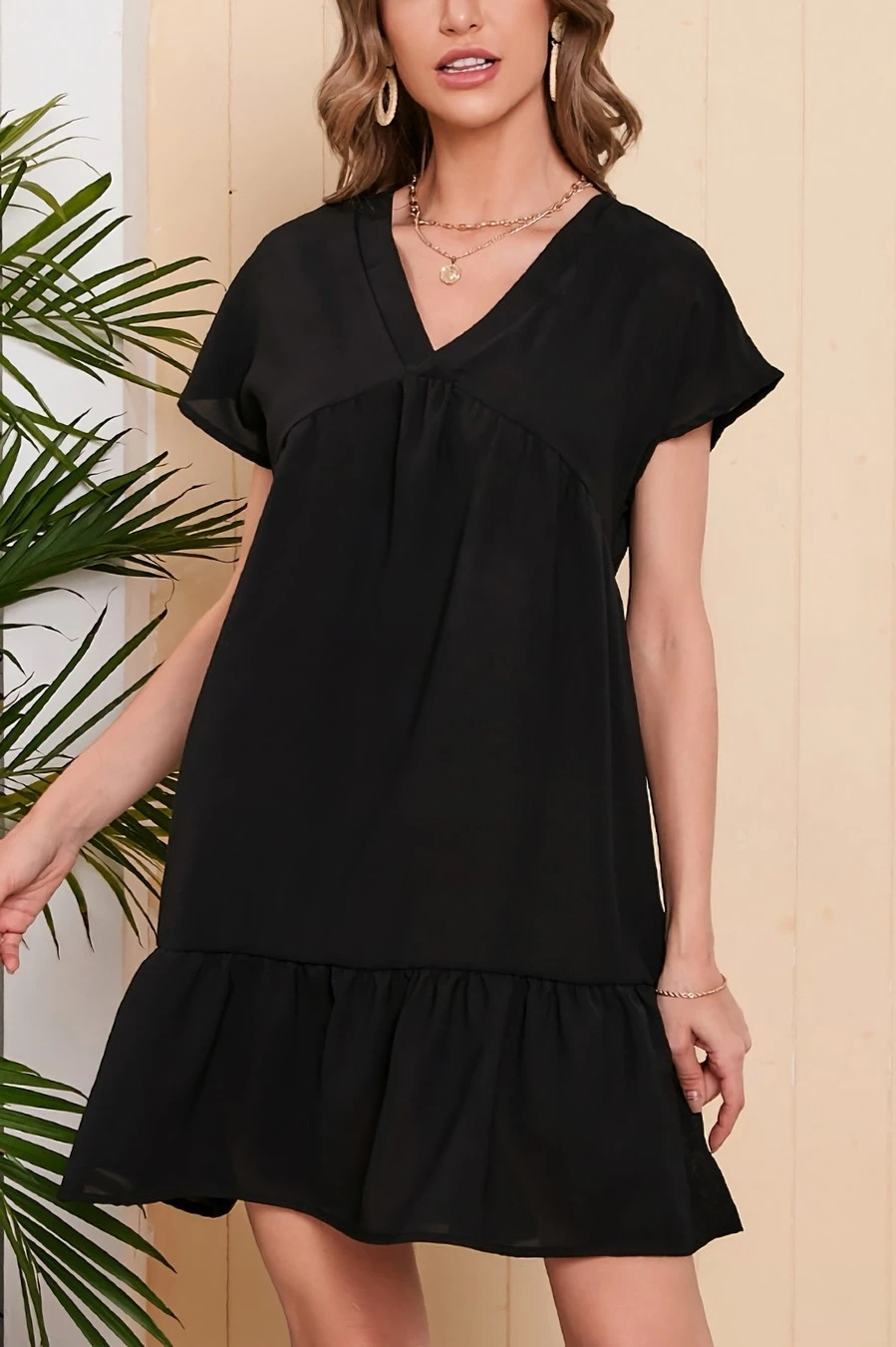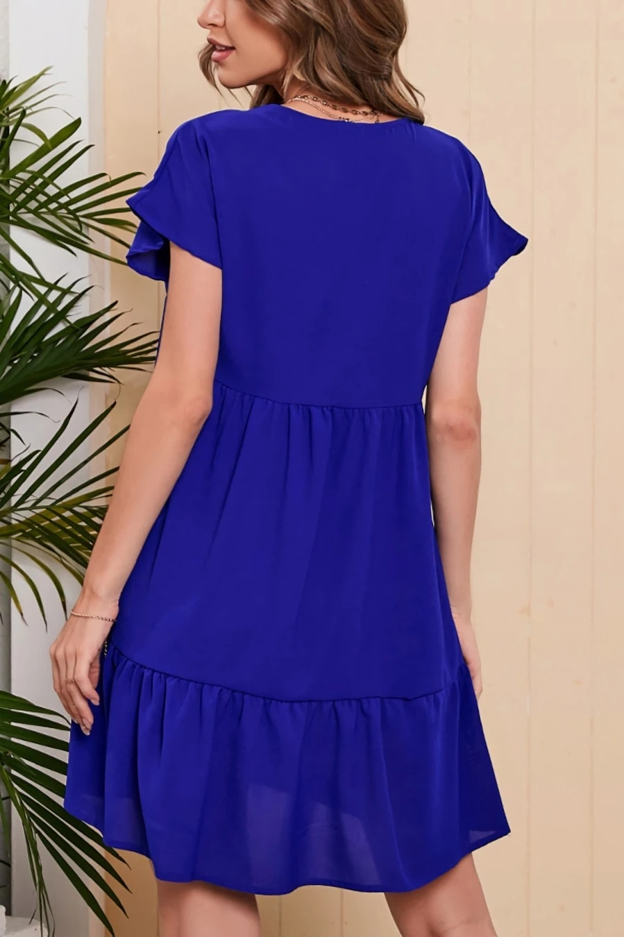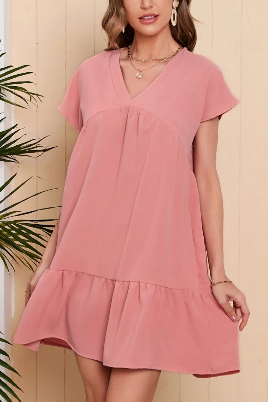 Summer new 4 colors solid color chiffonmesh patchwork inelastic v-neck ruffle shirring swing classic stylish mini dress