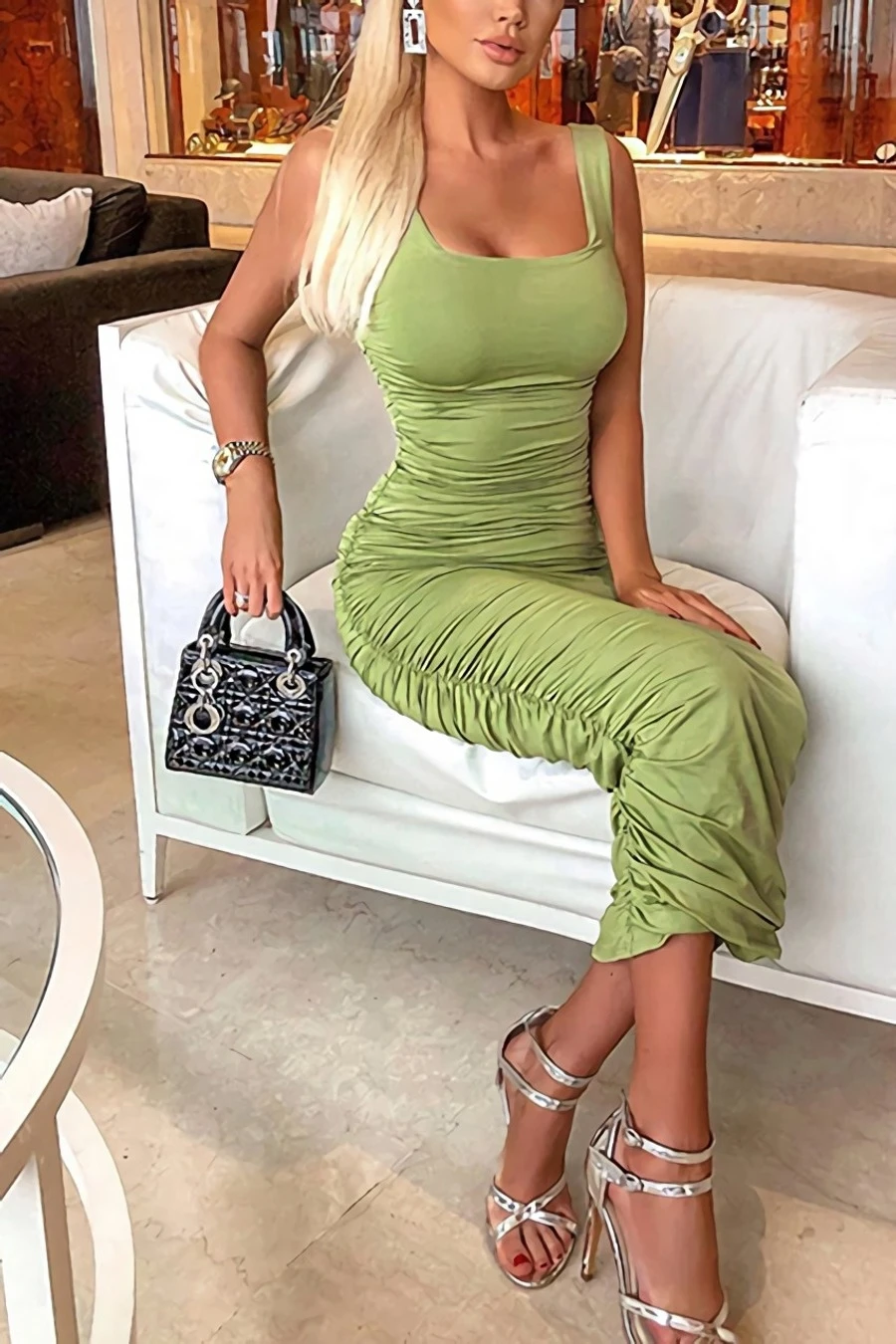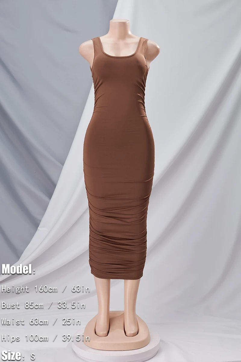 Summer new 4 colors solid color stretch strappy smocked bodycon stylish sexy midi dress