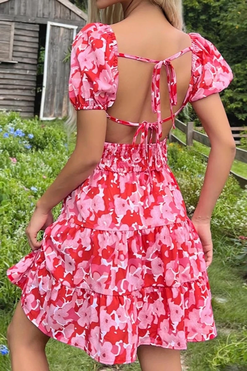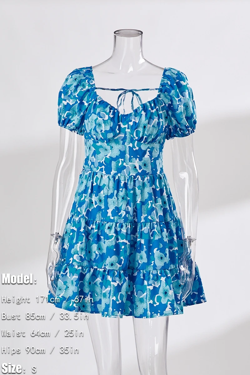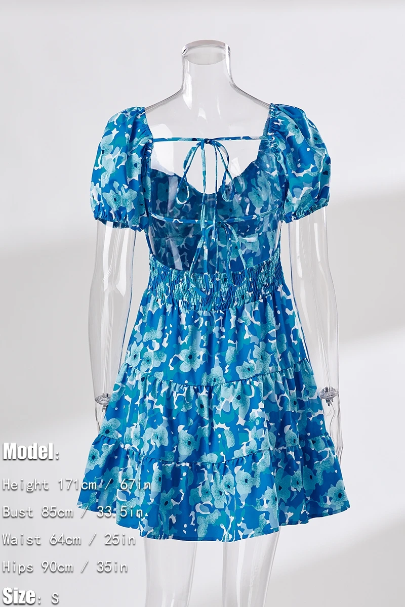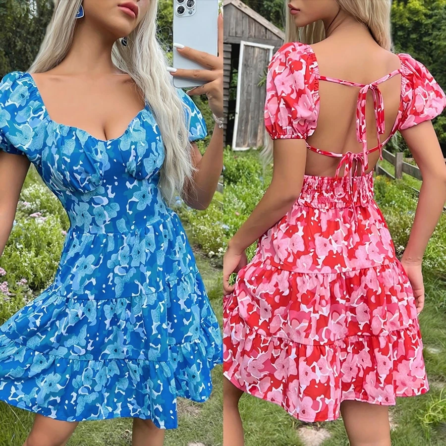 Summer new floral batch printing slight stretch ruffle smocked lace up backless stylish sexy mini dress