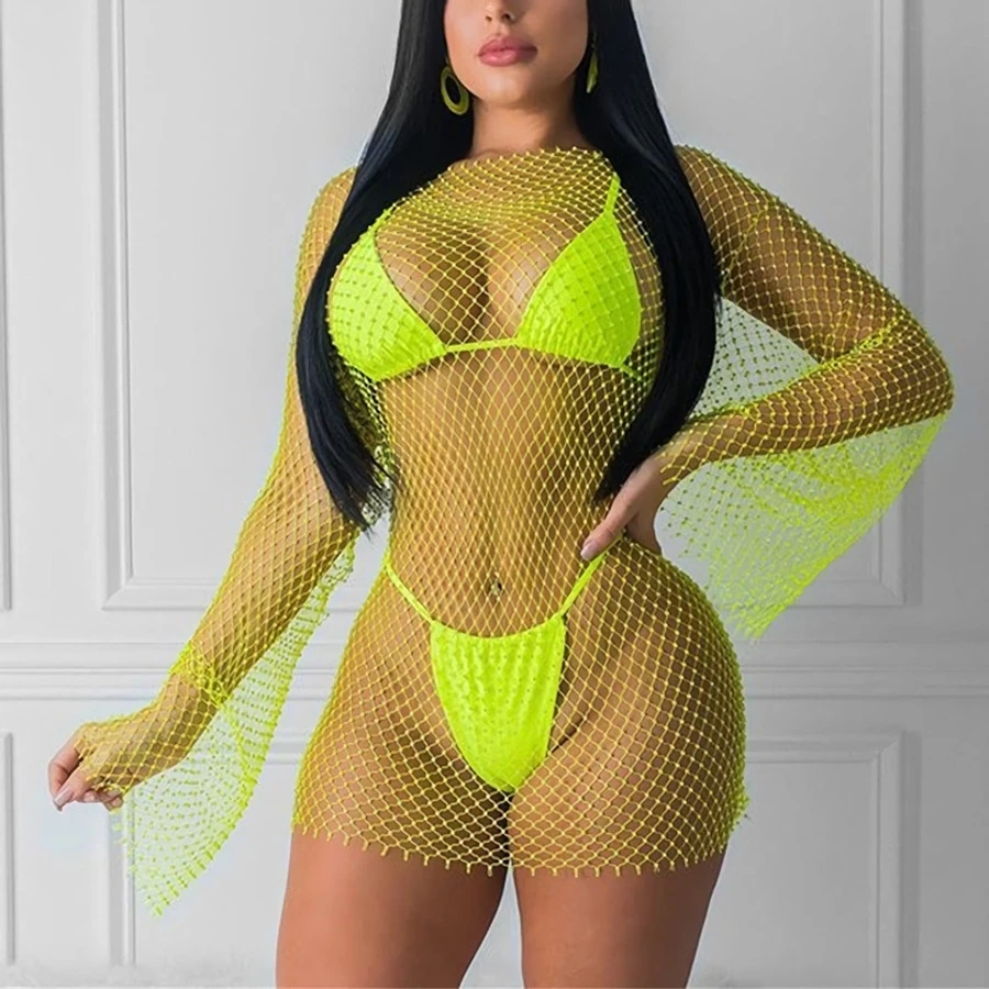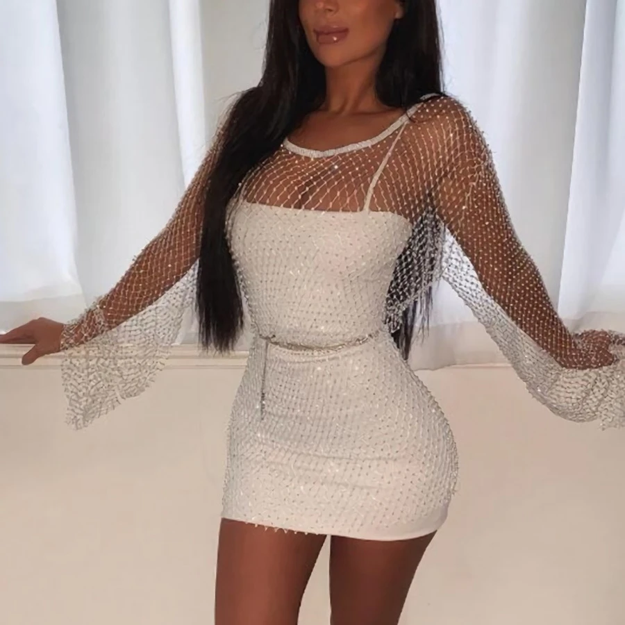 Summer new four colors fishnet rhinestone long bat sleeve sexy mini dress(no underwear)