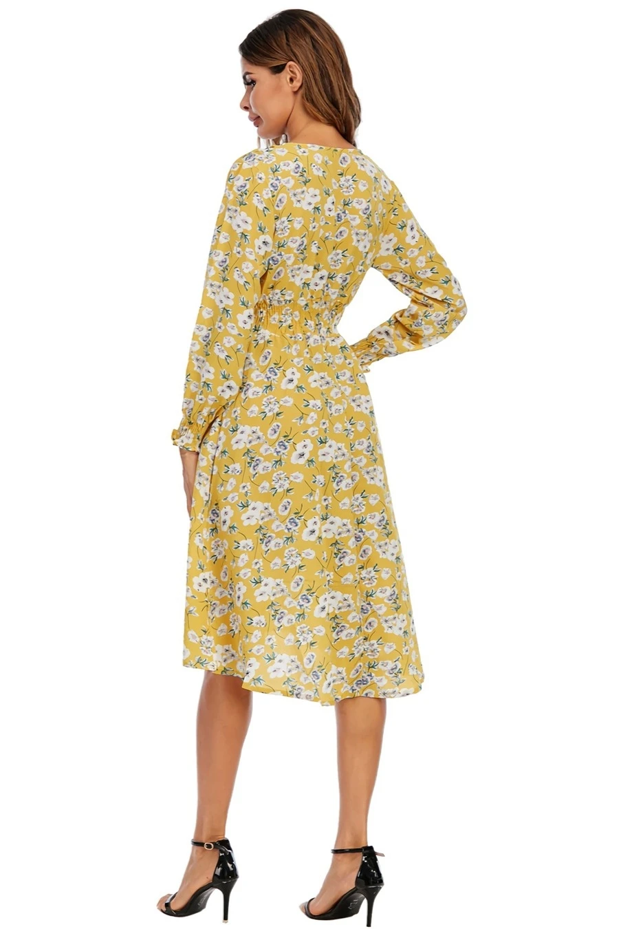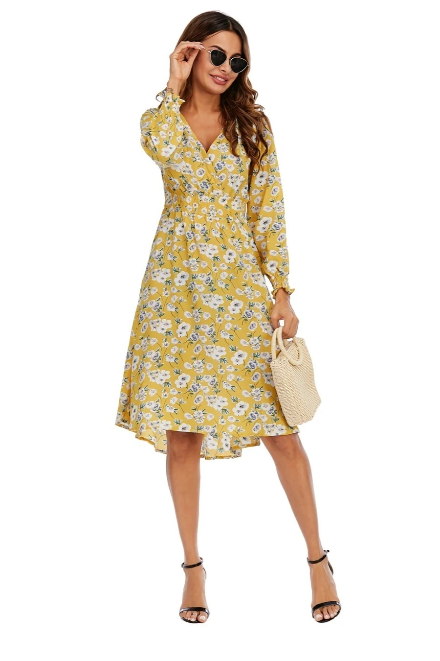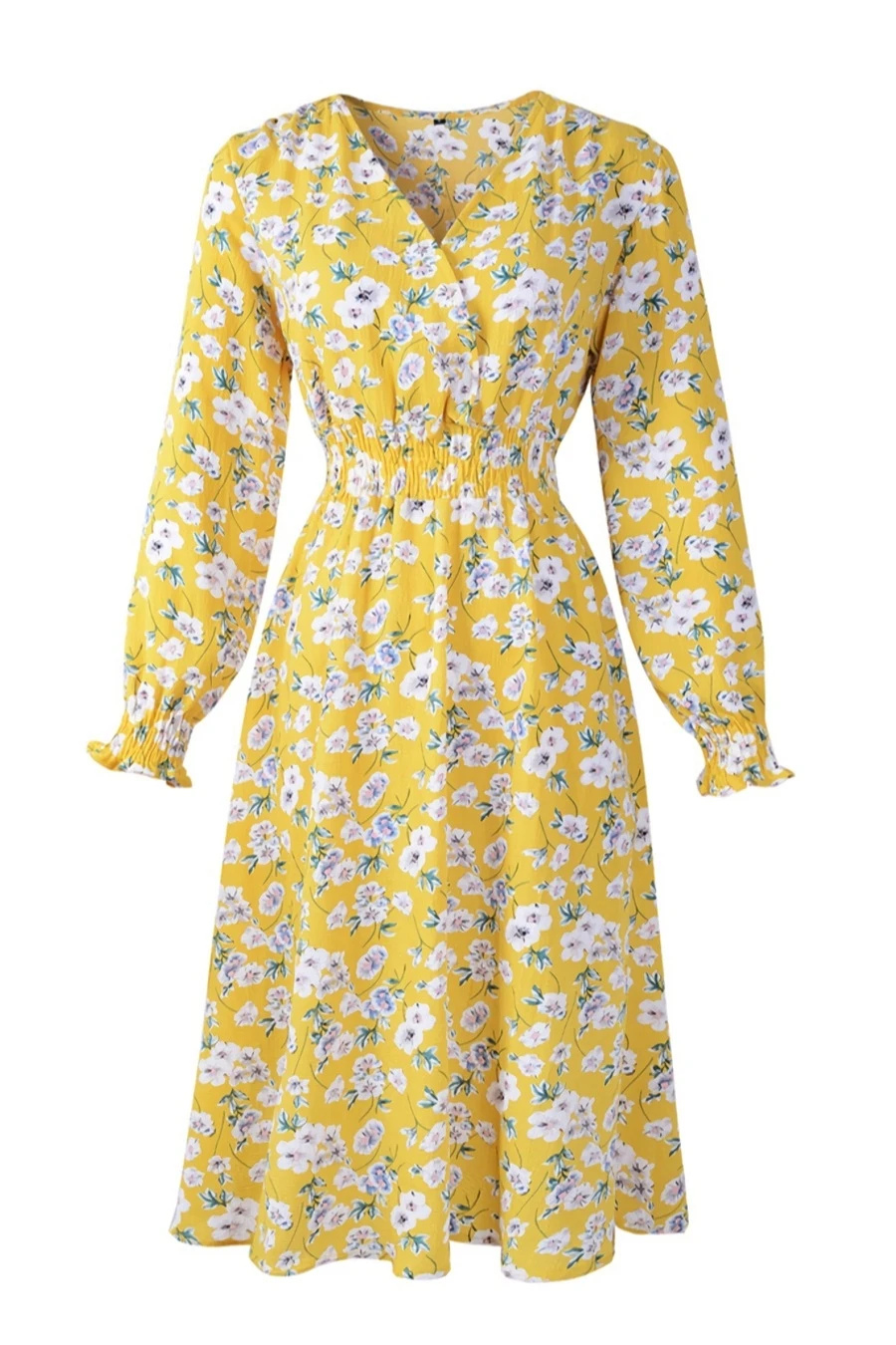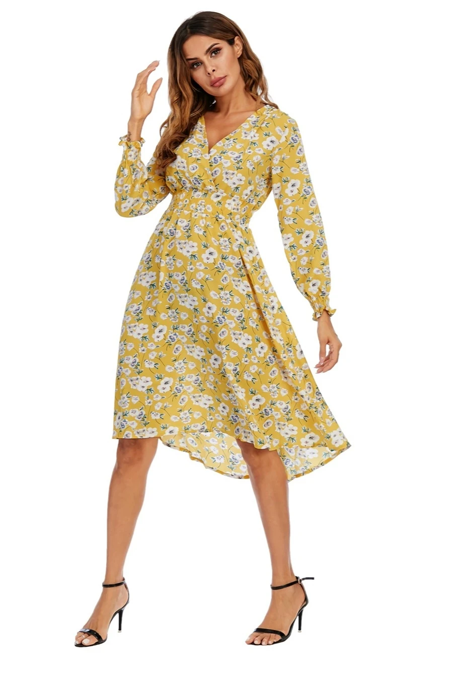 Summer new plus size floral batch printing inelastic long sleeves v-neck stylish casual midi dress