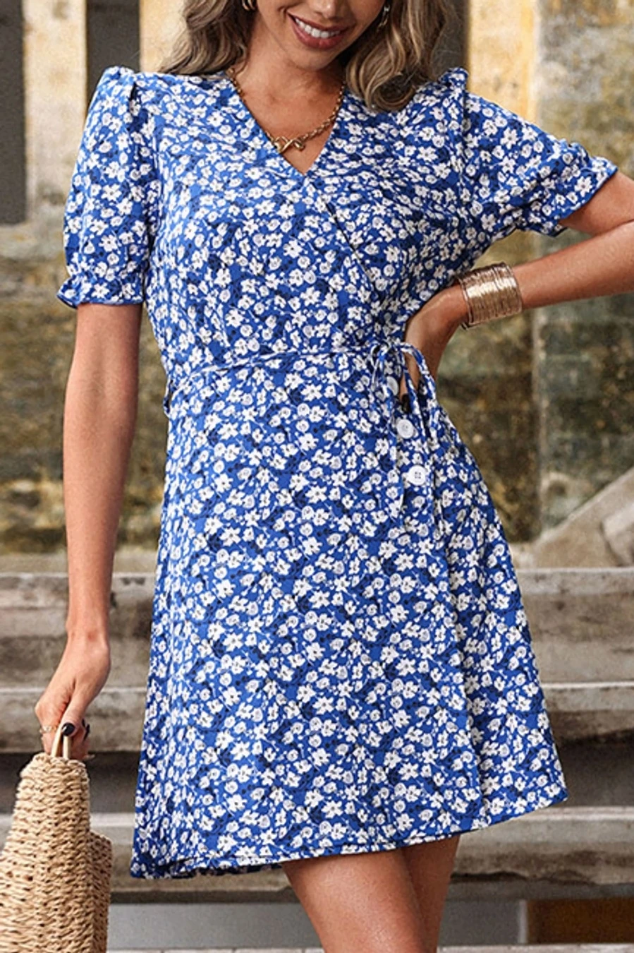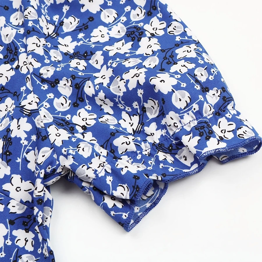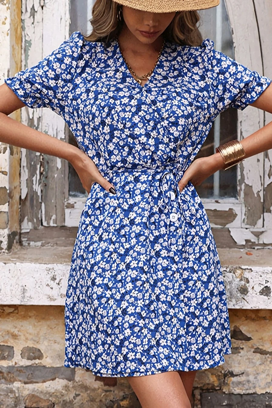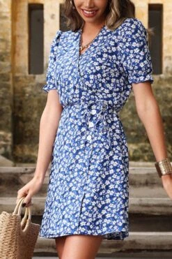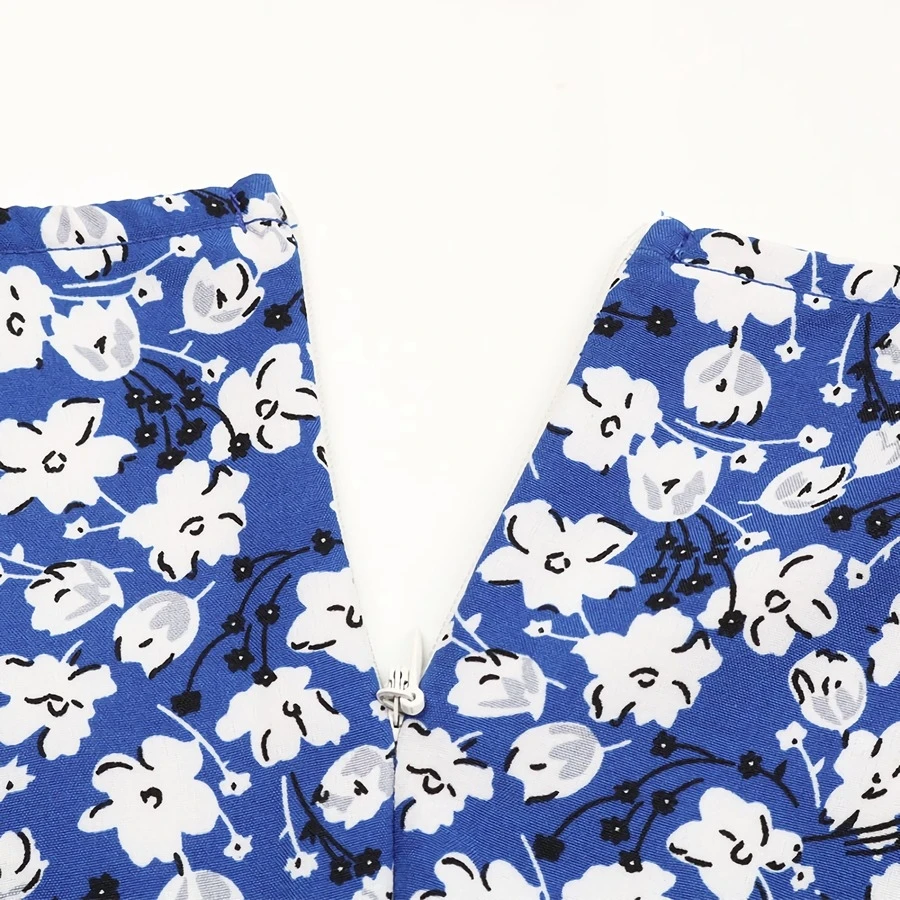 Summer new plus size floral batch printing inelastic short sleeve v-neck nipped waist frill trim zip-up stylish holiday mini dress (with belt)