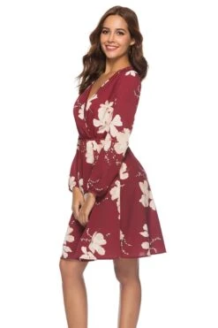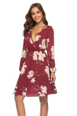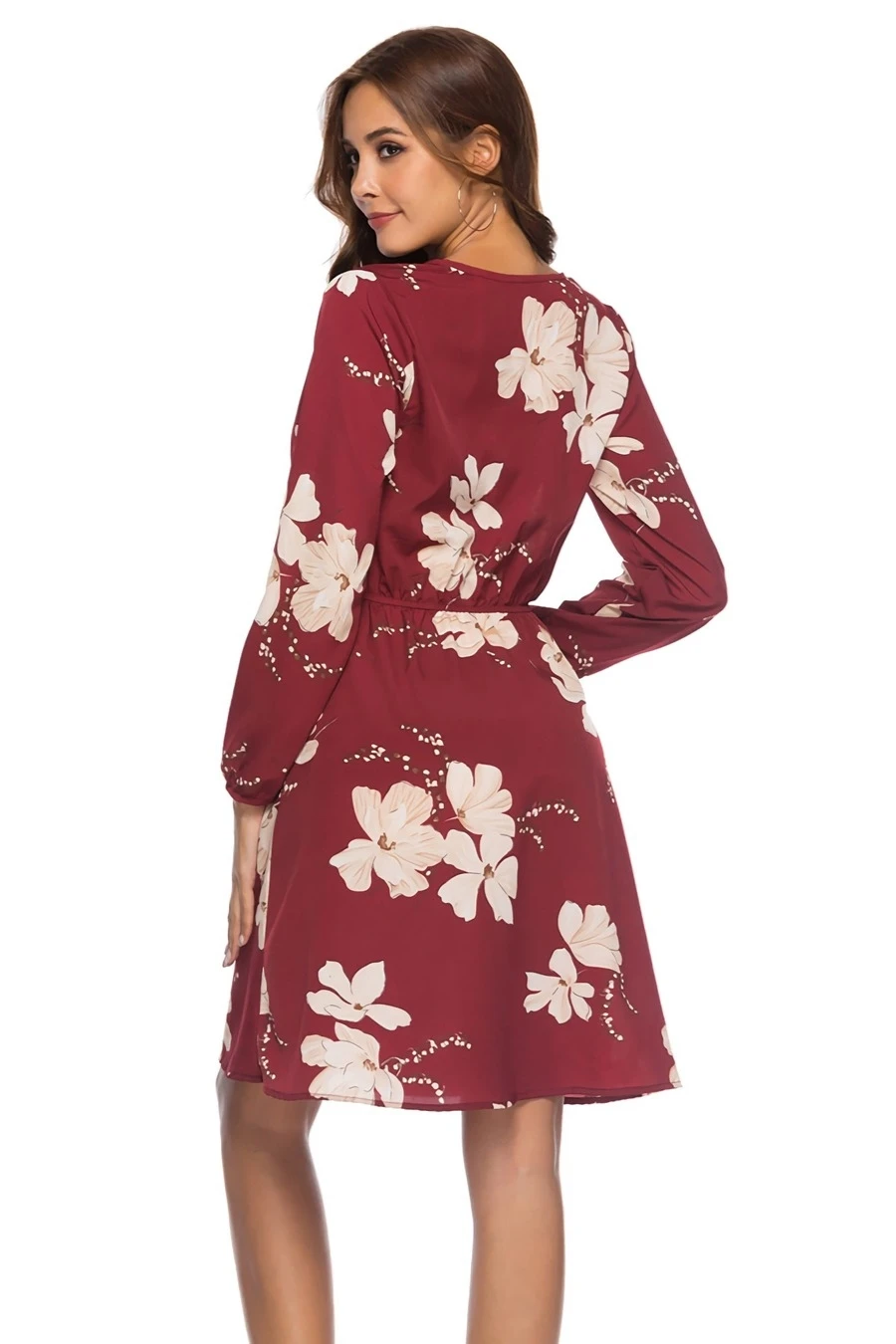 Summer new plus size flower batch printing inelastic v-neck shirring long sleeves waist stylish casual mini dress