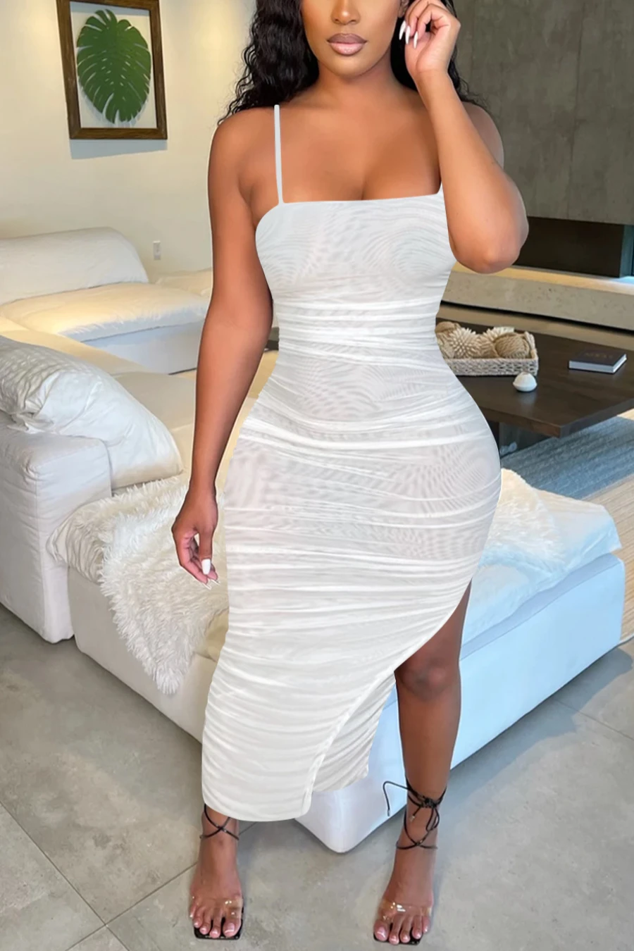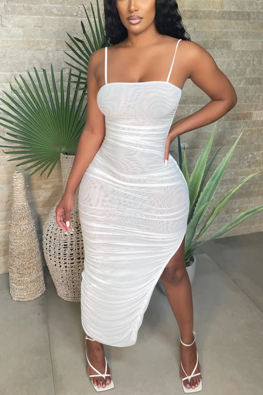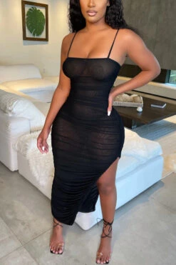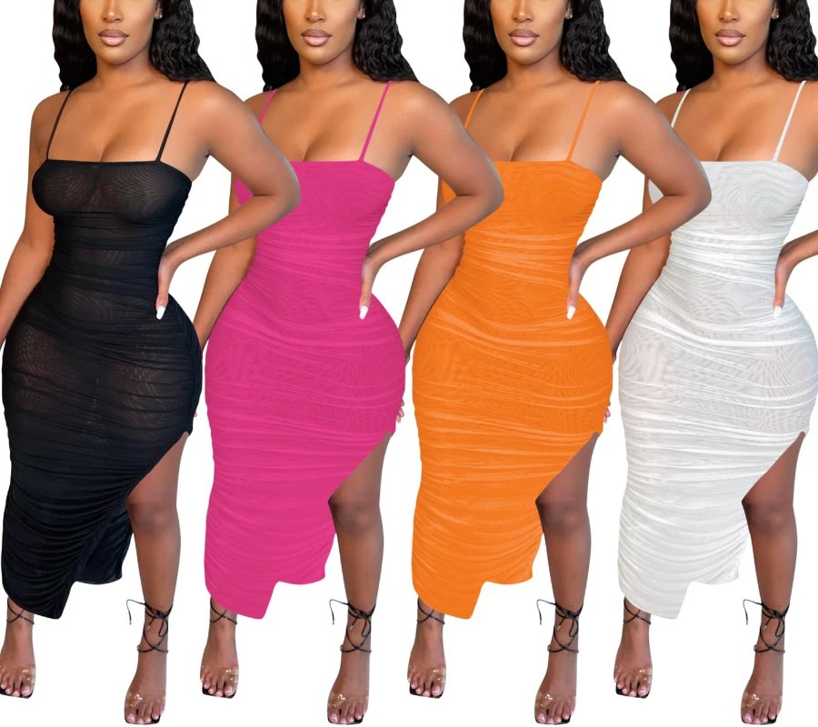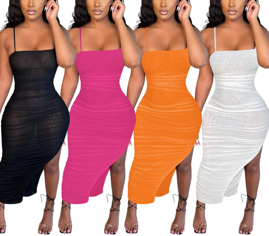 Summer new plus size see through mesh stretch adjustable straps ruched sexy irregular maxi dress (Without lining)