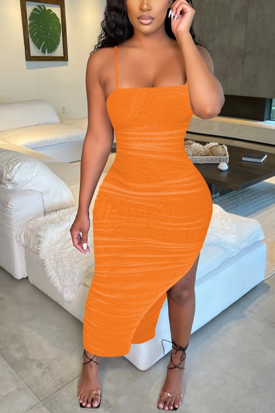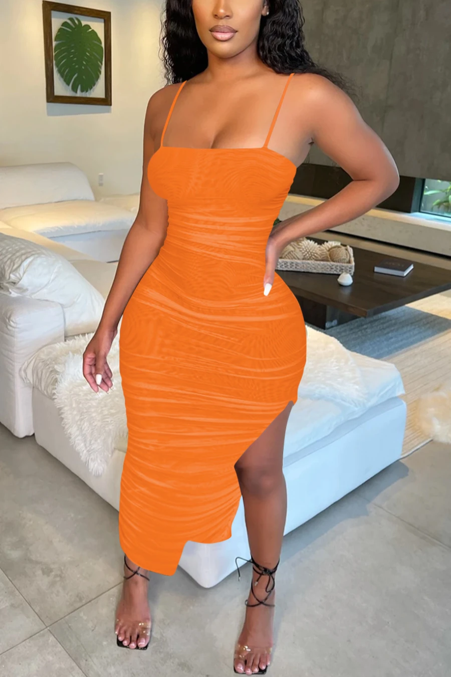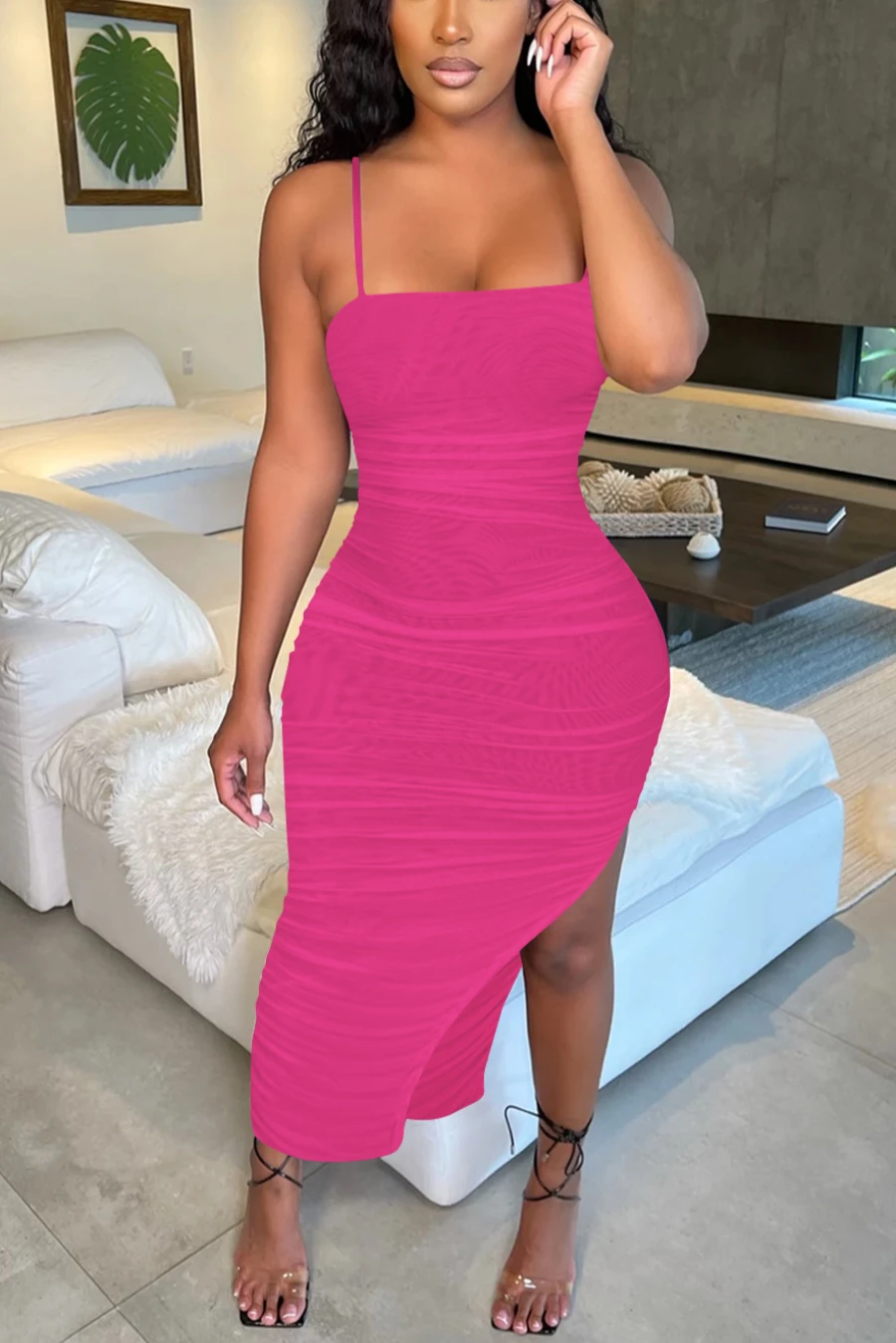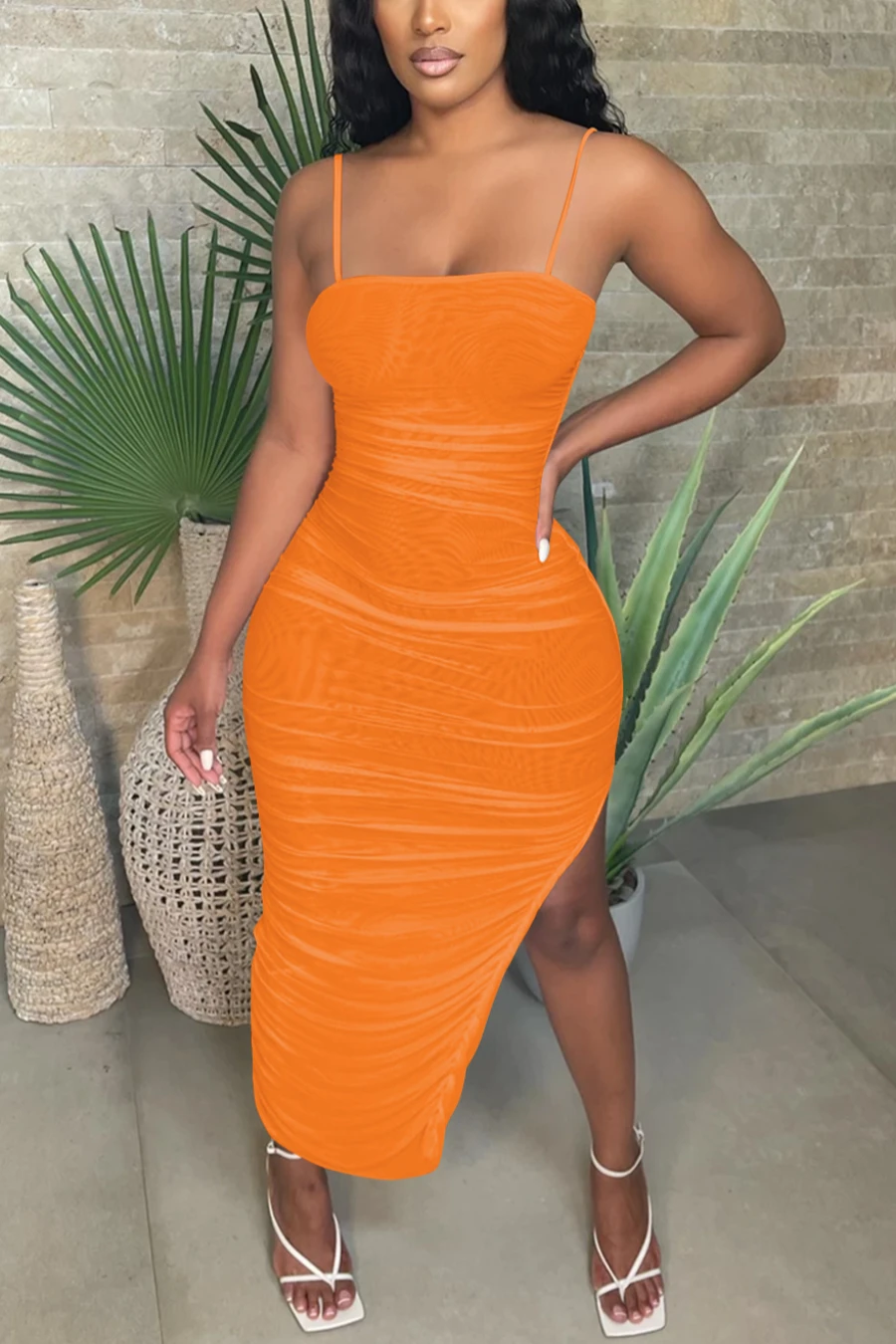 Summer new plus size see through mesh stretch adjustable straps ruched sexy irregular maxi dress (Without lining)