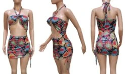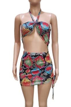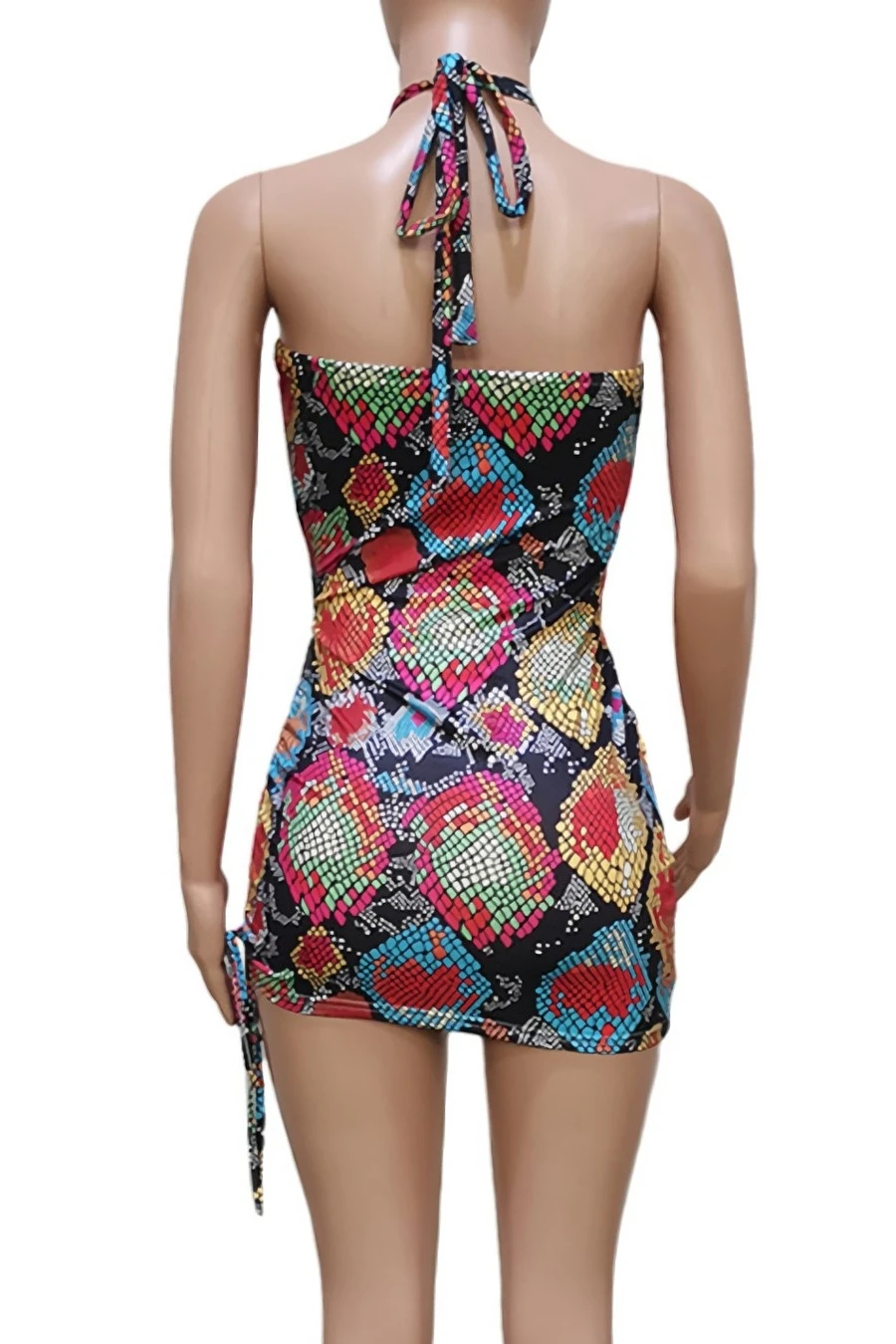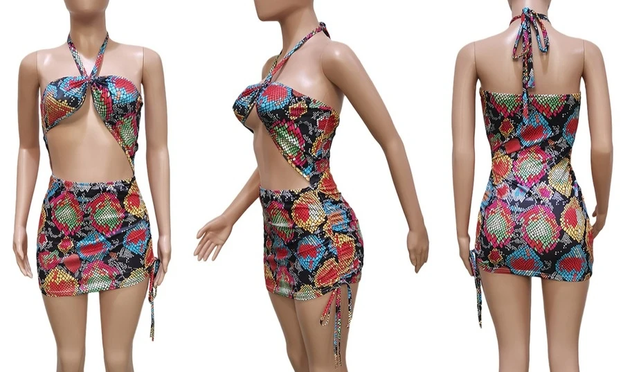 Summer new snake batch printing stretch halter-neck hollow drawstring design lace up shirring bodycon stylish sexy mini dress