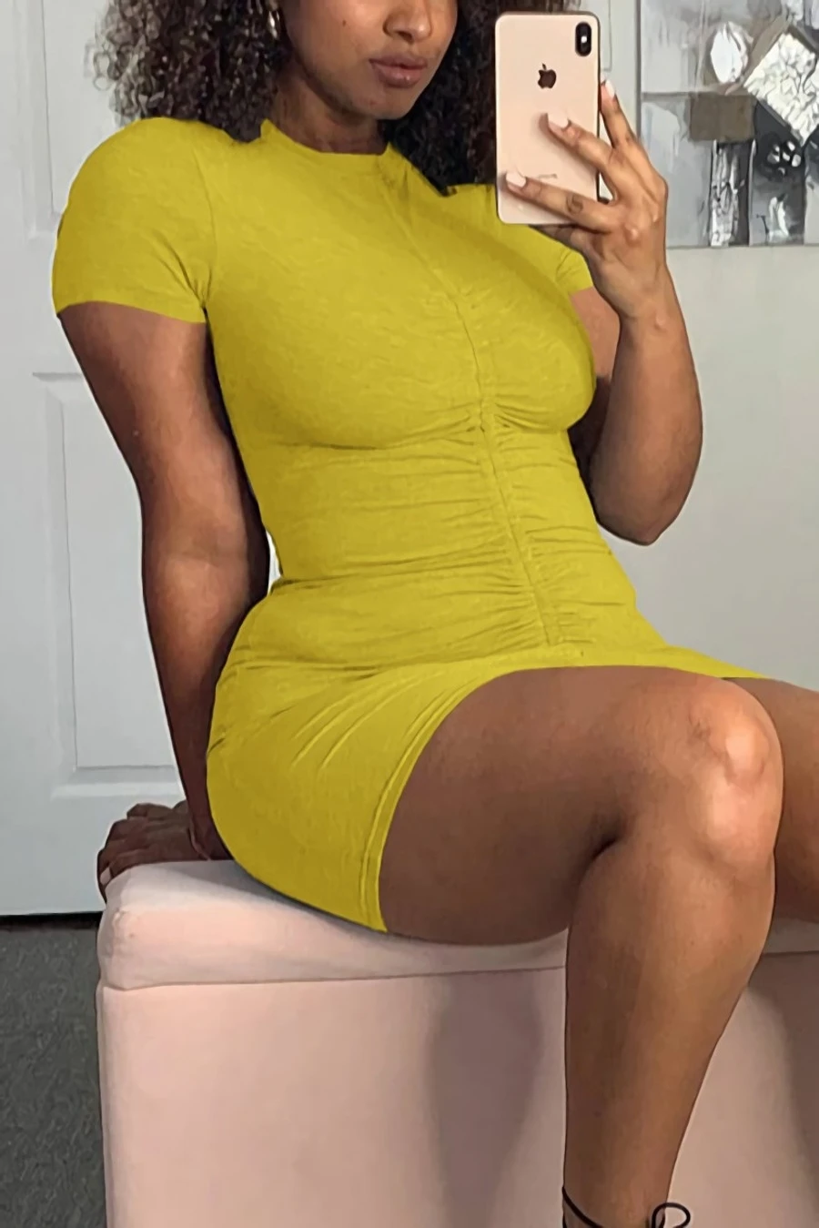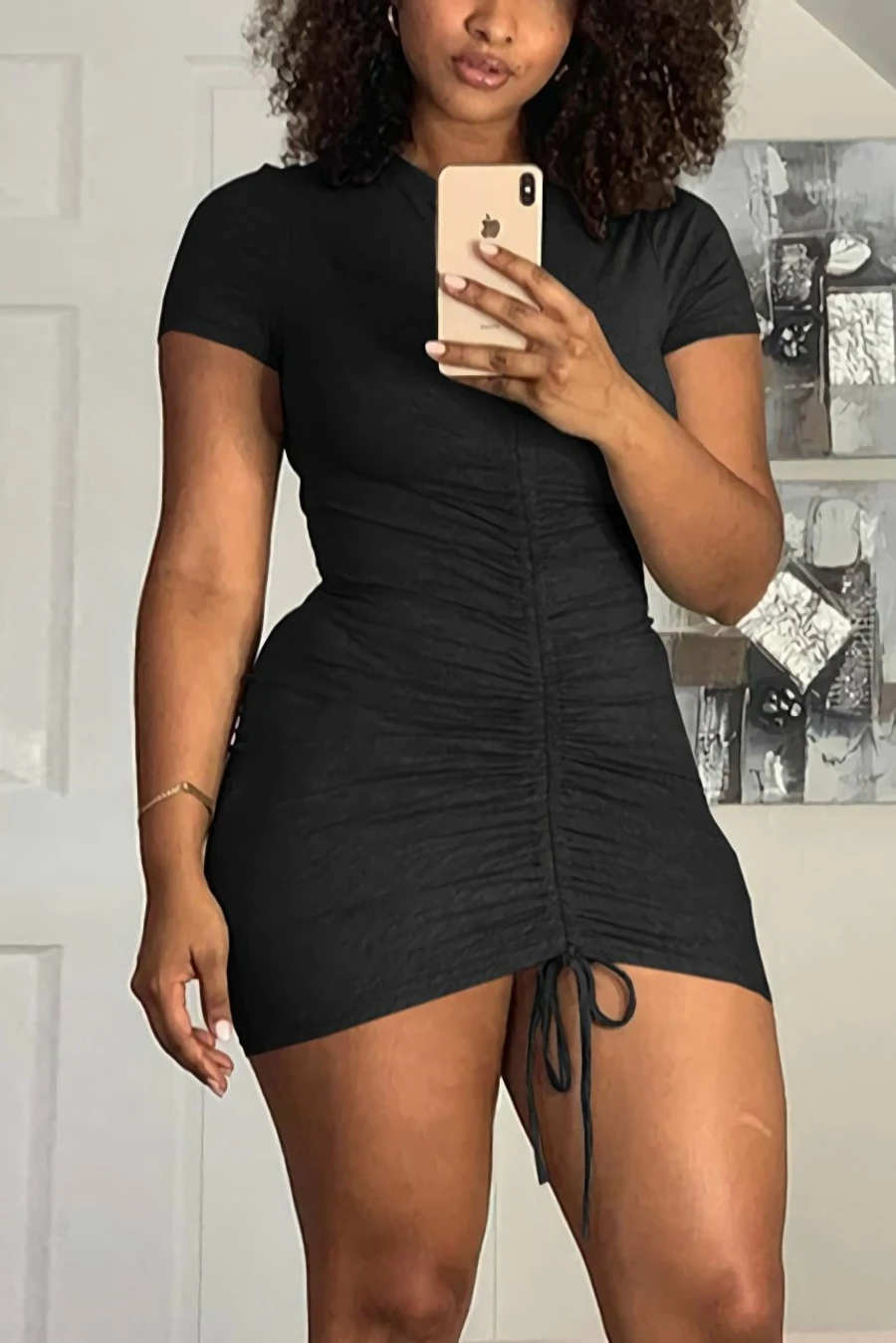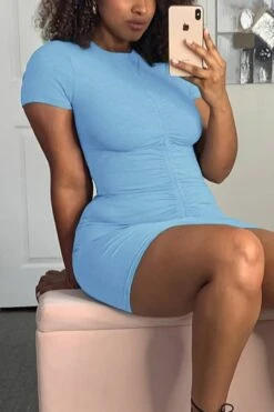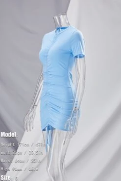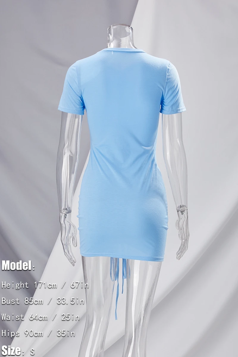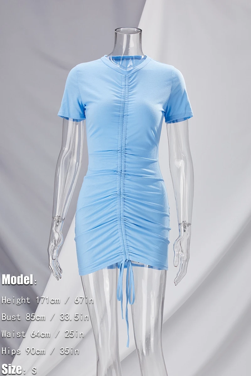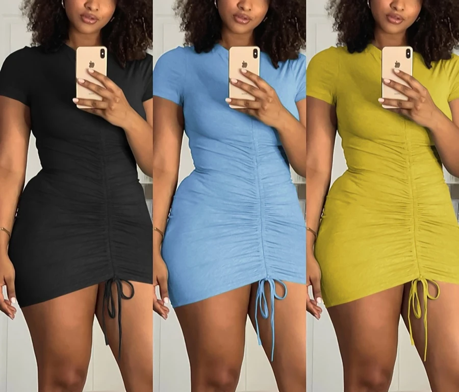 Summer new stylis solid color stretch pleated drawstring slim sexy mini dress